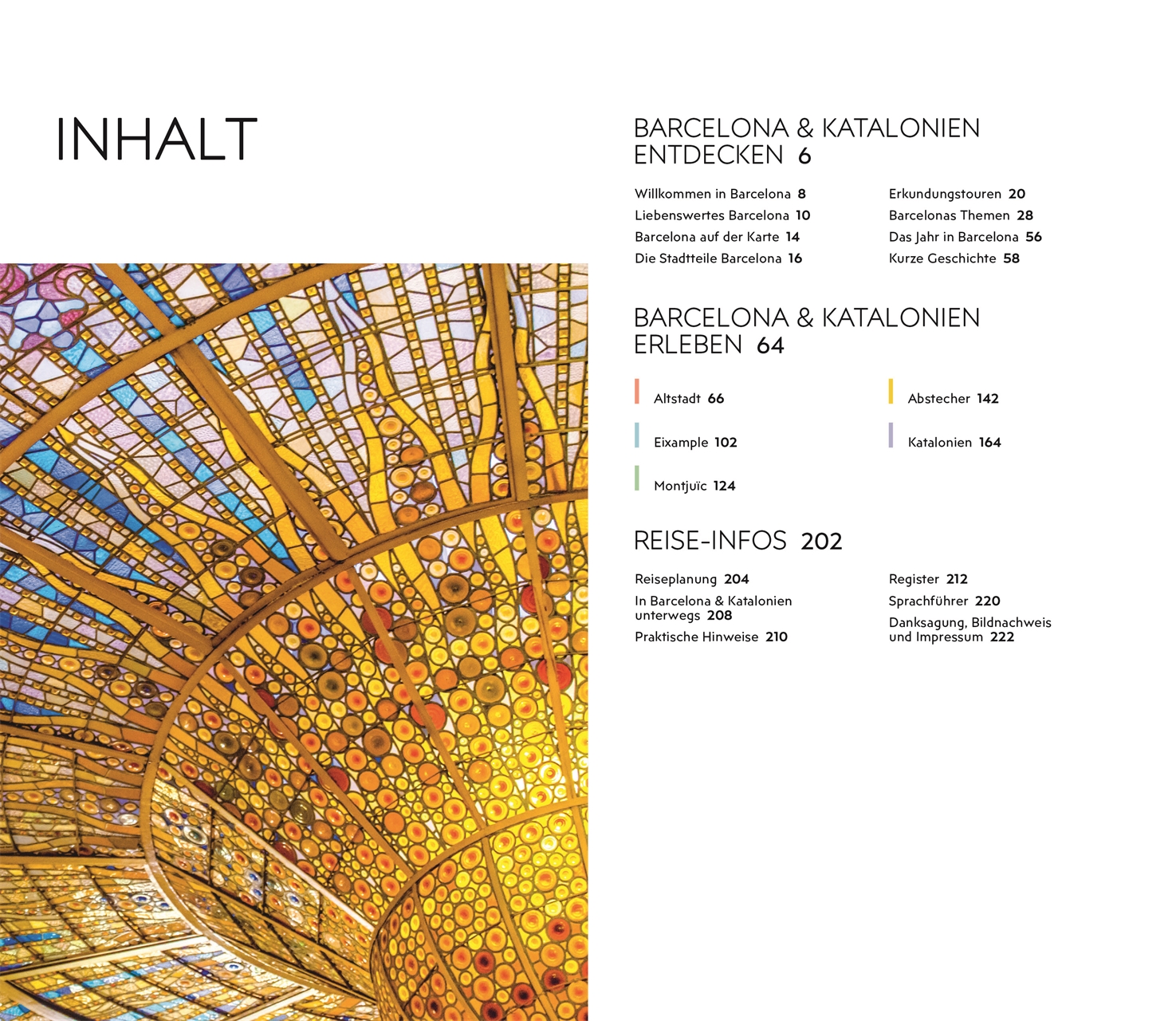 Die schönsten Stadtteile und Regionen: Die fabelhaftesten Orte stellen sich Ihnen im Reiseführer Barcelona & Katalonien Barrio für Barrio und Region für Region in ihrer gesamten Pracht vor mit fundierten und qualitativen Inhalten sowie unvergesslichen Highlights aus Kultur und Alltag. Von der Altstadt, die vom Boulevard La Rambla durchschnitten ist über Eixample, mit architektonischen Meisterwerken wie der Casa Milà bis zum Montjuïc, dem grünen Erholungsgebiet der Hafenstadt sowie der Umgebung Barcelonas. In einem extra Kapitel werden die schönsten Orte und Gegenden Kataloniens vorgestellt, wie beispielsweise Penedès, das bedeutendste Weinbaugebiet Spaniens.