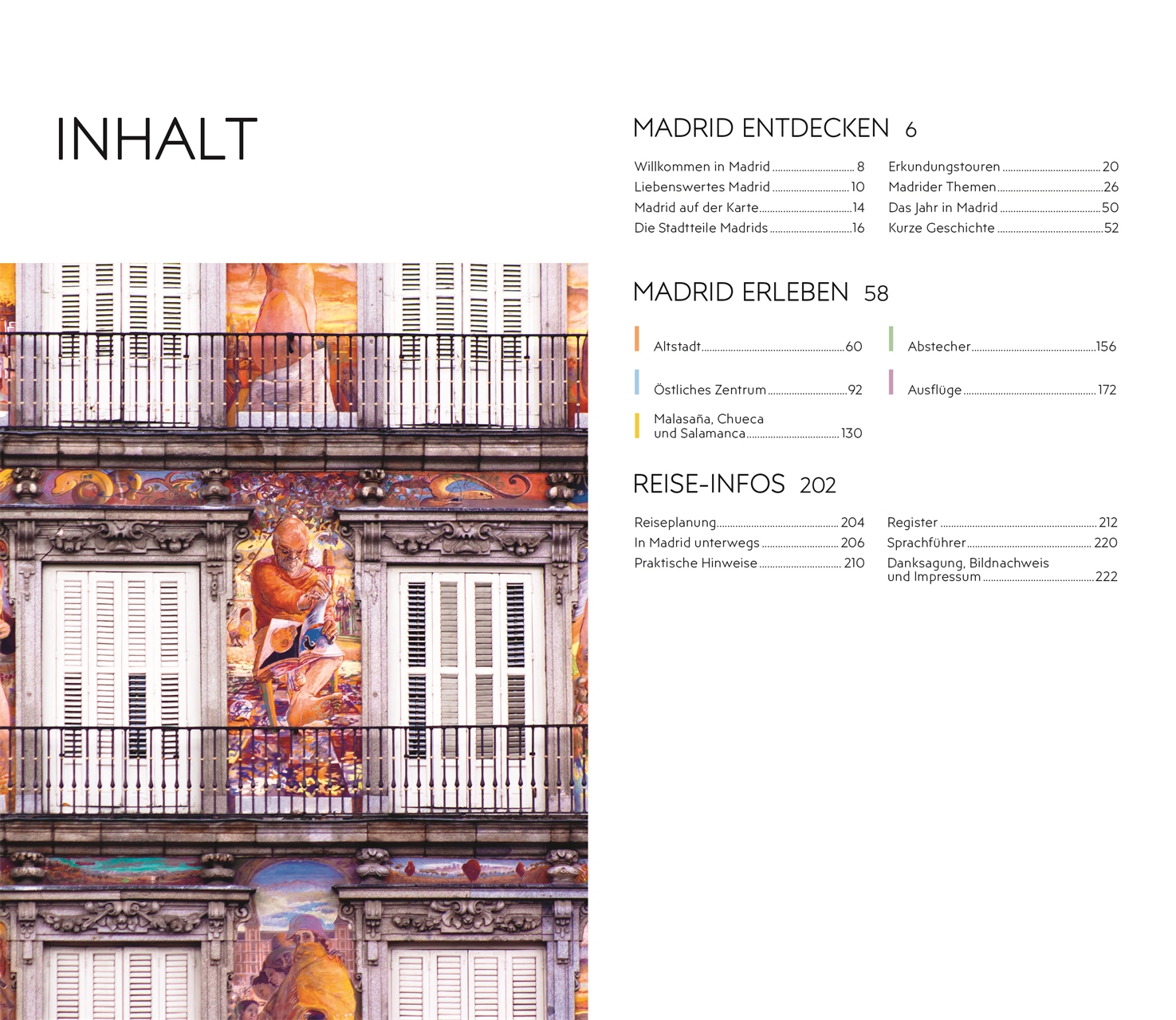 Die schönsten Stadtteile: Die fabelhaftesten Orte stellen sich Ihnen im Reiseführer Madrid Barrio für Barrio in ihrer gesamten Pracht vor mit fundierten und qualitativen Inhalten sowie unvergesslichen Highlights aus Kultur und Alltag. Von der Altstadt mit dem bunten Mercado San Miguel über das östliche Zentrum, wo sich im Goldenen Dreieck der Kunst weltberühmte Museen, wie das Museo Reina Sofia sammeln bis zu den Barrios Malasaña, Chueca und Salamanca, die bekannt sind für Shopping und ein lebendiges Nachtleben. Abstecher zeigen Sehenswürdigkeiten jenseits des Zentrums, wie etwa den Ägyptischen Templo del Debod. Spannende Ausflugstipps nehmen Sie mit ins Umland, beispielsweise ins malerische Segovia mit dem beeindruckenden Aquädukt.
