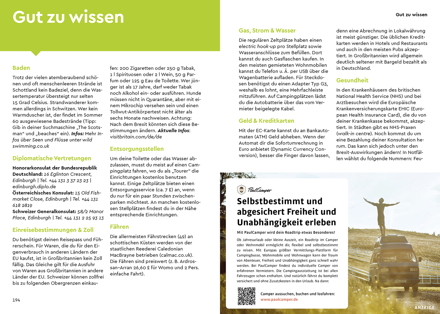 - Rundum-Sorglos-Paket: Wissenswertes zum Reiseziel wie das Freistehen, Anreiseinfos inkl. Fährverbindung, Camper-Wörterbuch Englisch, Packliste sowie Fahrzeugcheckliste