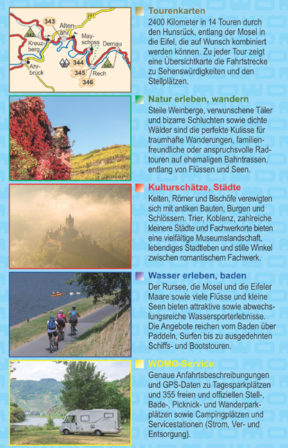 2400 km in 14 Touren durch den Hunsrück, entlang der Mosel in die Eifel, die auf Wunsch kombiniert werden können. Zu jeder Tour zeigt eine Übersichtskarte die Fahrtstrecke zu den Sehenswürdigkeiten und den Stellplätzen.