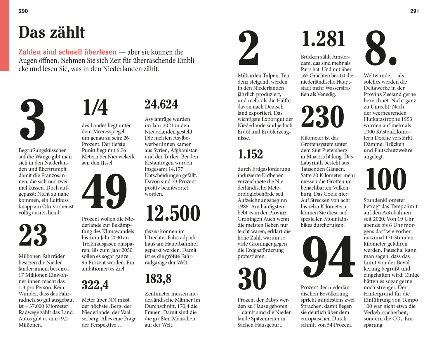 Senkrechtstarter, Überflieger, Querfeldein. Vor Ort - die Kapitel: Amsterdam und Noord-Holland, Rotterdam und Zuid-Holland, Die Watteninseln, Der Nordosten: Friesland, Groningen und Drenthe, Die Mitte: Flevoland, Overijssel, Utrecht und Gelderland, Der Süden: Zeeland, Brabant und Limburg. Das Kleingedruckte (Reiseinfos von A bis Z). Das Magazin. Offene Fragen.