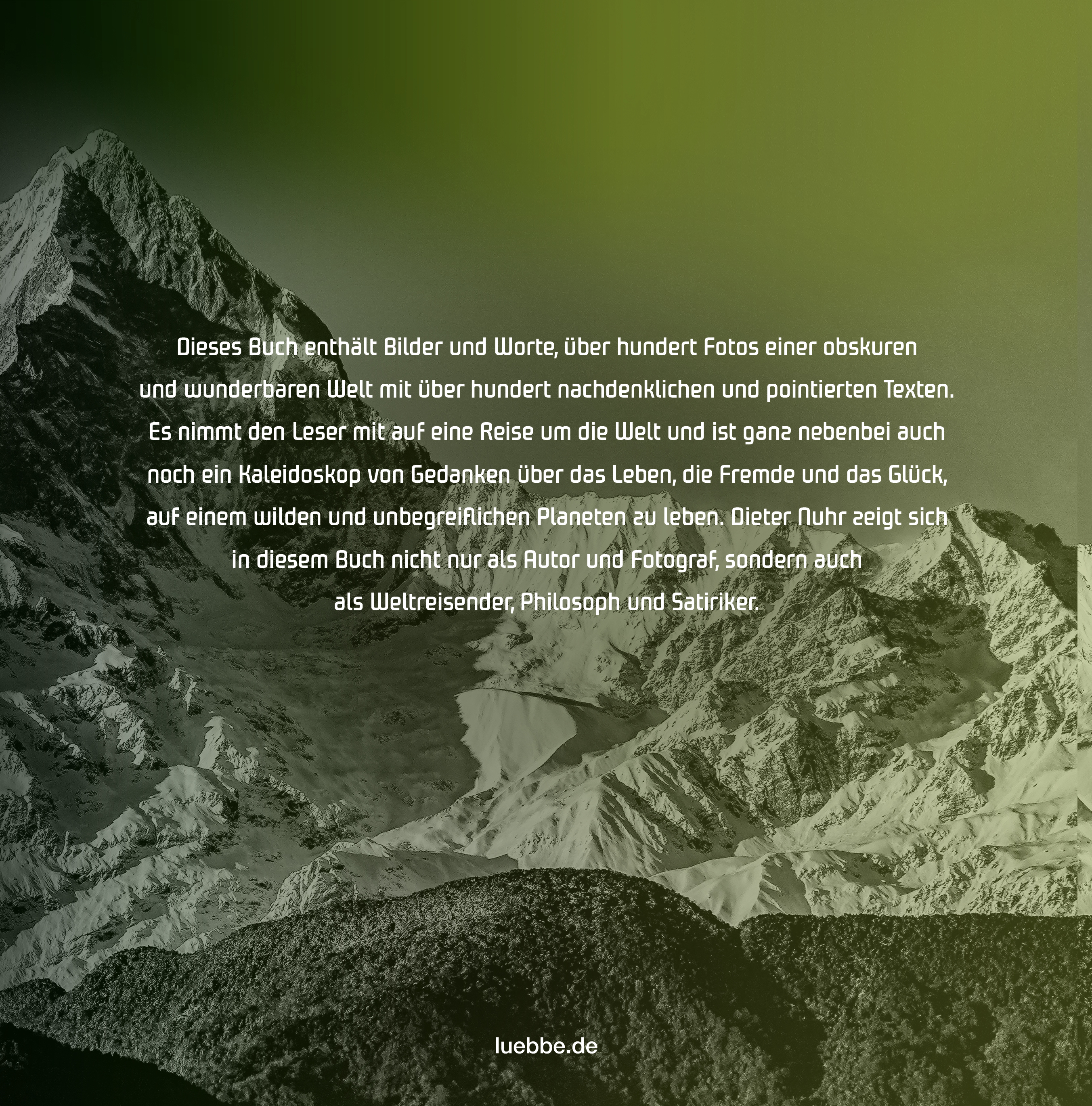 | Schlagworte | China • Die Rettung der Welt • Fernweh • Fotografie • Fremde • Gebäude • Gut für dich • Holland • Humor • Indien • Island • Kabarettist • Landschaft • Lettland • Momument • Nachdenklich • Natur • Nepal • Nuhr • Palast • philosophisch • Polen • Rocky Mountains • Sahara • Satiriker • schwarz/weiß • Schwarzweiß • Schwarz-Weiß • Spanien • Städte • Weltreise • Wildnis |