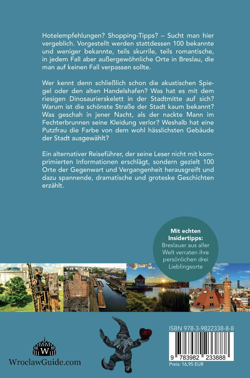 *** Gewinnertitel des Selfpublishing-Buchpreises 2021 in der Kategorie Sachbuch/Ratgeber ***Hotelempfehlungen? Shopping-Tipps? - Sucht man hier vergeblich. Vorgestellt werden dafür 100 bekannte und weniger bekannte, teils skurrile, teils romantische, in jedem Fall aber außergewöhnliche Orte in Breslau, die man auf keinen Fall verpassen sollte. Wer kennt denn schließlich schon die akustischen Spiegel oder den alten Handelshafen? Was hat es mit dem riesigen Dinosaurierskelett in der Stadtmitte auf sich? Warum ist die schönste Straße der Stadt kaum bekannt? Was geschah in jener Nacht, als der nackte Mann im Fechterbrunnen seine Kleidung verlor? Weshalb hat eine Putzfrau die Farbe von dem wohl hässlichsten Gebäude der Stadt ausgewählt?Ein alternativer Reiseführer, der seine Leser nicht mit komprimierten Informationen erschlägt, sondern gezielt 100 Orte der Gegenwart und Vergangenheit herausgreift und dazu spannende, dramatische und groteske Geschichten erzählt. Außerdem bricht er mit der Tradition, dass nur der Autor zu Wort kommt - denn zahlreiche Breslauer, bekannte und unbekannte, verraten ihre drei ganz persönlichen Lieblingsorte!