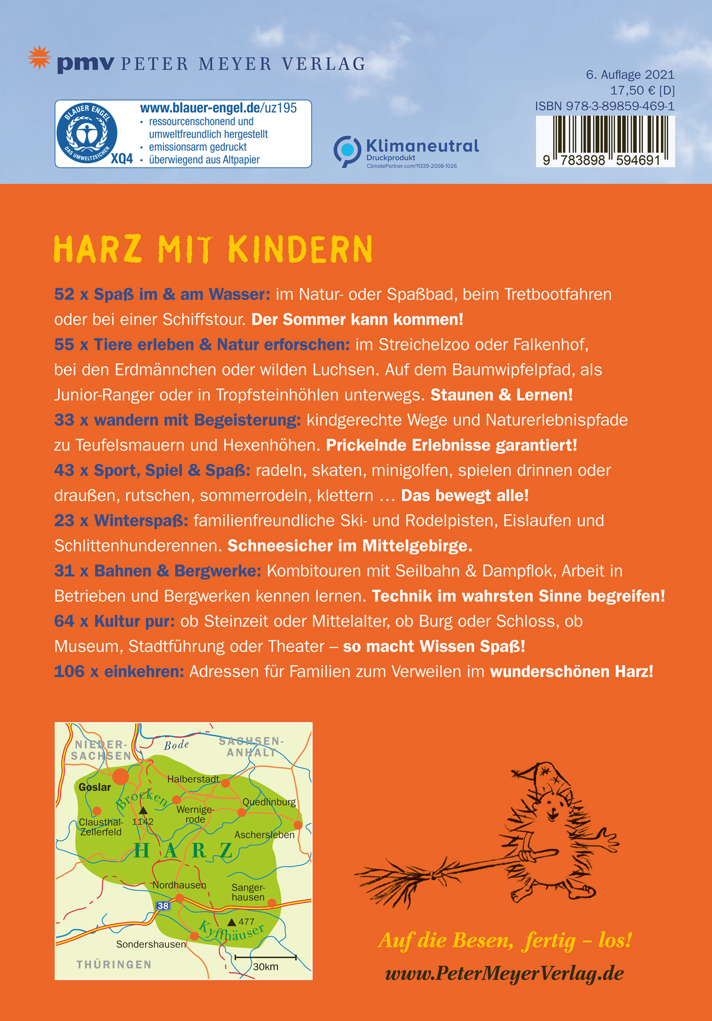Wochenende oder Ferien stehen vor der Tür, doch was unternehmen? Die erfahrene Reiseführer-Autorin Kirsten Wagner präsentiert in »Harz mit Kindern« 350 spannende Touren und Aktivitäten für Kinder von 3 bis 13 Jahren. Dabei geht es zwischen Braunschweig, Göttingen und Magdeburg unter Tage ins Silberbergwerk oder hoch hinaus in den Baumwipfelpfad, im Winter rodeln Schneebegeisterte am Wurmberg. Alle Tipps sind frei kombinierbar und mit Altersangaben versehen. Kleine Tierfreunde können im Wildgehege Luchse aus nächster Nähe beobachten, ältere Kids toben sich im Bikepark am Blocksberg aus. An den vielen Zusatztipps erkennt man sofort, dass die Autorin alle Ausflüge vor Ort getestet hat. Dazu kommen praktische Infos wie Öffnungszeiten, Preise und zahlreiche Einkehrtipps. Der große Kartenatlas stellt zudem sicher, dass alle den Weg finden. Angaben zu Bus- und Bahnanfahrten unterstreichen die umweltfreundliche Ausrichtung des Verlages. In diesem Buch finden Eltern ein passendes Nachschlagewerk für jede Wetterlage und der Nachwuchs kommt garantiert auf seine Kosten!