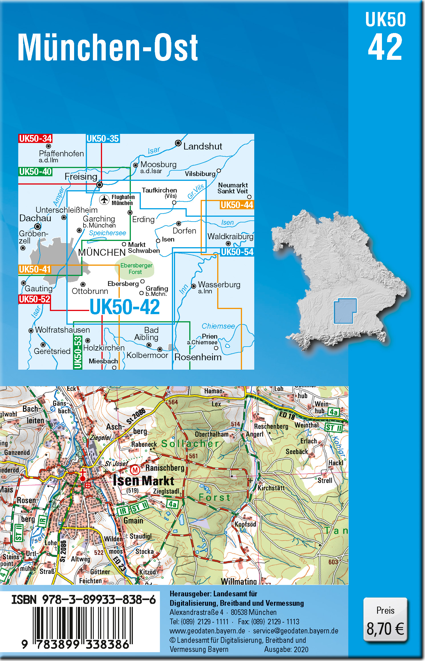Die amtliche Reihe der UK50 (Umgebungskarte 1:50000) bietet für zusammenhängenden bayerische Regionen gezielte Freizeitinformationen.Kartengrundlage ist die TK50 (Topographische Karte 1:50000) mit UTM-Gitter für GPS-Nutzer und Geländedarstellung.Der Karteninhalt veranschaulicht uns den gesamten östlichen BereichMünchens. Da diese Region nur leicht geneigt ist, bietet sie denRadlern ideale Voraussetzungen. Aber auch die Wanderer findenzwischen Erdinger Moos und Glonn viele attraktive Routen. UnterschiedlicheEinzelziele wie der Wildpark Poing, der Flughafen Münchenoder die Erdinger Therme ermöglichen eine abwechslungsreicheFreizeitgestaltung.Im südlichen Teil des Kartenblattes prägen große Staatsforsten dieLandschaft. Manche Ortschaften scheinen wie Inseln in die Waldflächeneingefügt. Dazu zeichnen geradlinige "Geräumte" (Waldschneisen)ein schachbrettartiges Muster in den Baumbestand. Der ca.90 km² große Ebersberger Forst bietet durch seine Umweltstation(Museum und Lehrpfad) nicht nur Naherholung, sondern auch vielWissenswertes. Zusätzliche Anziehungspunkte sind der 36 m hohe"Aussichtsturm Ludwigshöhe" oder die "Sauschütt Hohenlinden" mitseinen Wildgehegen.Weiter im Osten präsentiert die Karte ein reizvolles Hügelland. Hierdurchziehen viele lebendige Bäche die abwechslungsreicheMoränenlandschaft. Oft bieten Badeseen, wie der Egglburger See, derKastenseeoner See oder der Steinsee den Radlern und Wanderern einewillkommene Erfrischung.