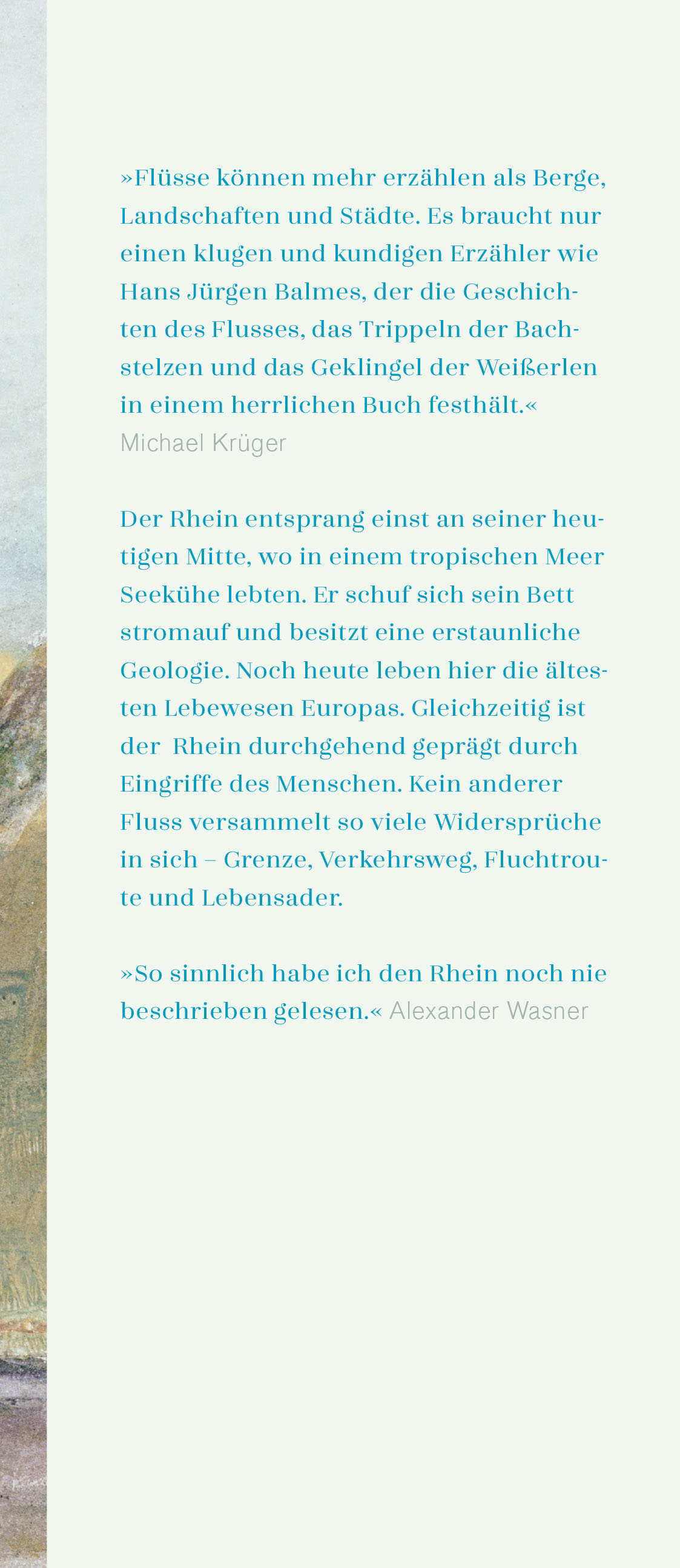 Hans Jürgen Balmes nimmt uns mit auf eine Reise entlang des Flusses. Wir begegnen Menschen, die wie William Turner den Rhein zu ihrer Sehnsucht und Lebensaufgabe machten. Wir sehen Wälder und Tiere, die in traumhaften Naturbetrachtungen und meditativen Bildern gegenwärtig werden. Ein Buch über den Rhein, der uns mit dem unerschöpflichen Fließen seiner Geschichten gefangen nimmt wie mit seiner Stille. Nature Writing at its best!