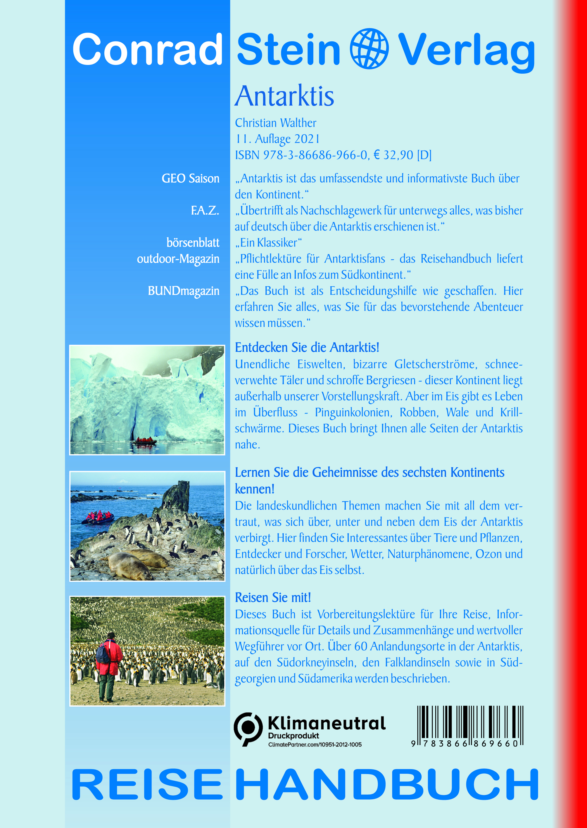 „Pflichtlektüre für Antarktisfans: Das Reisehandbuch liefert eine Fülle an Infos zum Südkontinent“ (Outdoor-Magazin zur 7. Auflage)