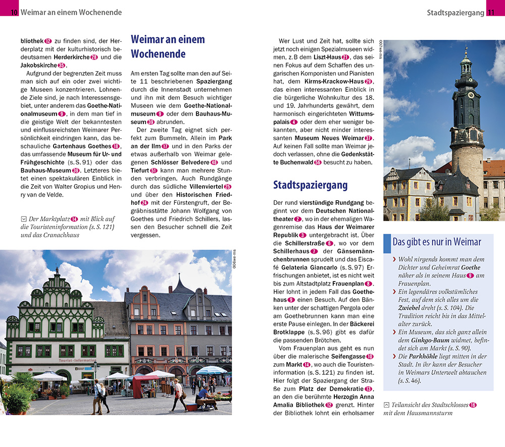 Weimar, die kleine Weltstadt mit großem Geist und ländlichem Charme, begeistert mit einer beeindruckenden kulturellen Vielfalt. Am Flüsschen Ilm gelegen, sind hier weitläufige Parks ebenso zu finden wie historische Baudenkmäler. Geheimrat Goethe und den Ideen des Bauhauses begegnet man noch heute auf Schritt und Tritt. Dank zahlreicher Studenten und Besucher kommen aber auch Kulinarik und Kneipenleben nicht zu kurz. In vielen kleinen Läden kann man zudem nach Designprodukten aus der Region stöbern.Dieser aktuelle Stadtführer ist der ideale Begleiter, um alle Seiten der thüringischen Residenzstadt selbstständig zu entdecken:- Die wichtigsten Sehenswürdigkeiten und Museen der Stadt sowie weniger bekannte Attraktionen und Viertel ausführlich vorgestellt und bewertet- Faszinierende Architektur: Renaissancefassaden, Bauhaus-Ikonen und Goethes schlichtes Gartenhaus- Abwechslungsreicher Stadtspaziergang- Erlebnisvorschläge für ein langes Wochenende- Ausflüge nach Jena, zu den Schlössern Belvedere, Tiefurt und Ettersburg sowie zur Gedenkstätte Buchenwald- Shoppingtipps vom traditionellen Markt bis zu den schönsten Kunsthandwerksläden- Die besten Lokale der Stadt und allerlei Wissenswertes über die thüringische Küche- Tipps für die Abend- und Nachtgestaltung: vom Nationaltheater bis zum angesagten Studentenklub- Goethe, Schiller, Herder und Wieland: das Weimarer Viergestirn und die Weimarer Klassik- Weimar zum Träumen und Entspannen: Frauenplan, Park an der Ilm, Historischer Friedhof, Webicht-Wald, Park Belvedere und Park Tiefurt- Ausgewählte Unterkünfte von preiswert bis ausgefallen- Alle praktischen Infos zu Anreise, Preisen, Stadtverkehr, Touren, Events, Hilfe im Notfall ...- Hintergrundartikel mit Tiefgang: Geschichte, Mentalität der Bewohner, Leben in der Stadt ...- Faltplan zum Herausnehmen- Mit kostenloser Web-App für Smartphone, Tablet und PC! (siehe unten)