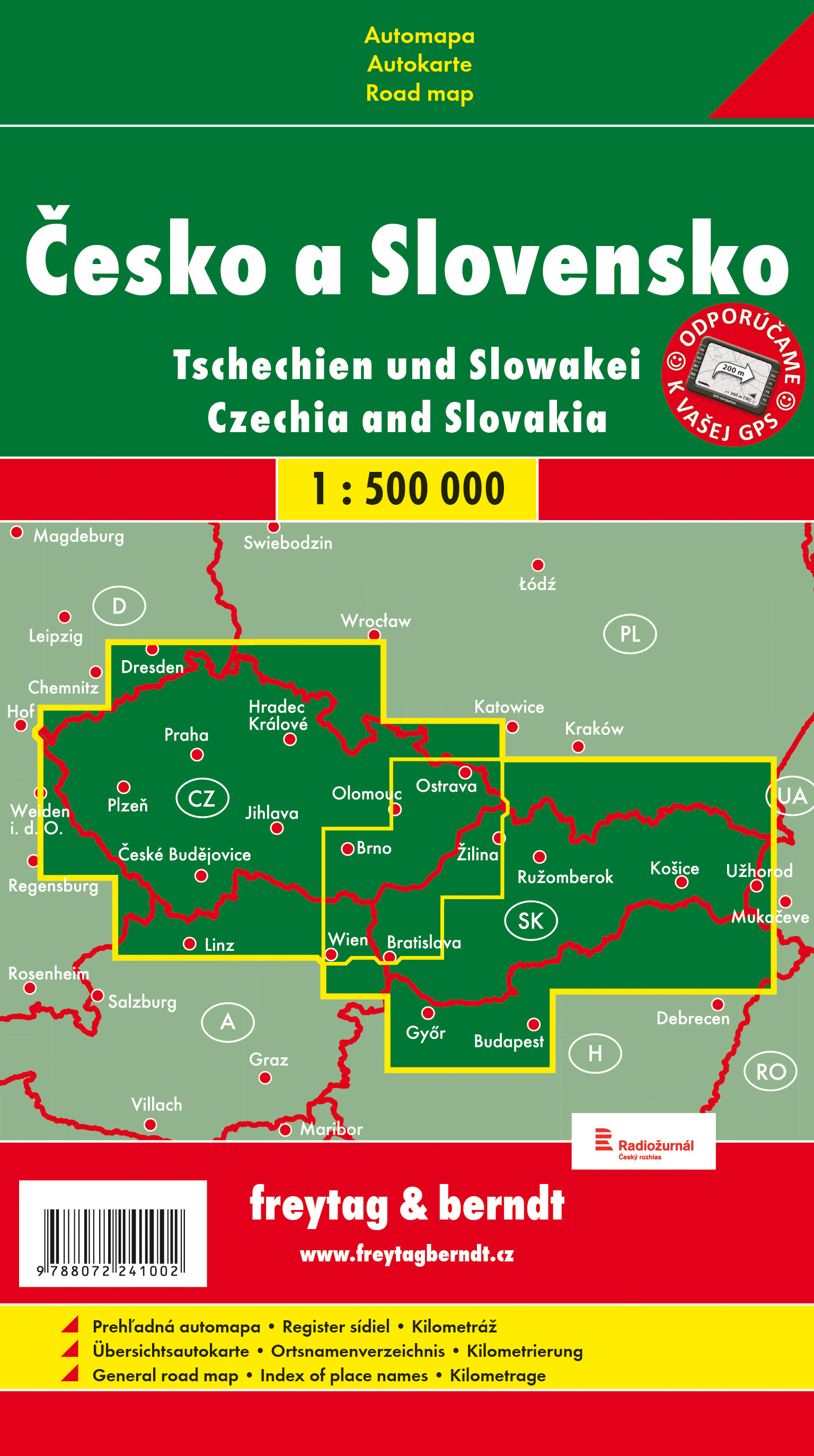 Detaillierte Autokarte der Tschechien und der Slowakei im Maßstab 1: 500.000 mit vielen Extras. Es fehlt auch nicht ein umfangreiches Ortsregister.