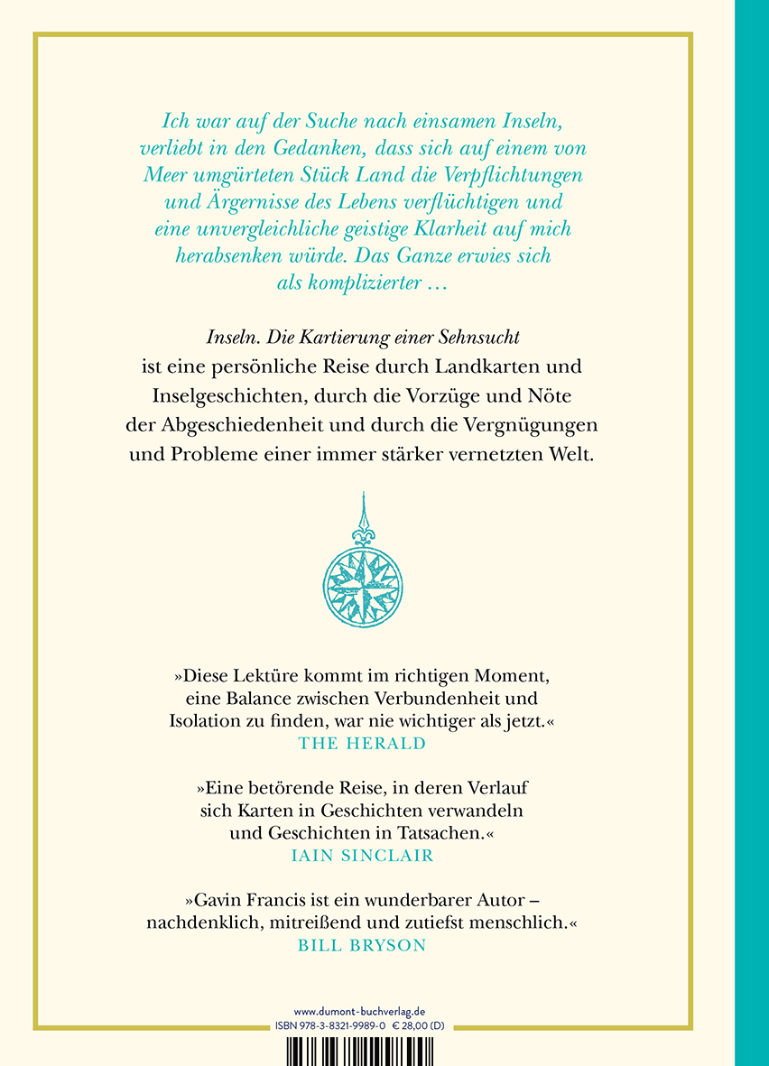 »Setzt [...] Inseln ein literarisches Denkmal« Eva Krafczyk, DPA »Kunstvolles Island-Hopping, nicht nur in reisearmen Zeiten.« 3SAT KULTURZEIT »So dicht und atmosphärisch sind seine Beschreibungen, dass man meint, Möwenschreie zu hören und von der fiktiven Gischt nass zu werden [...] ein meditatives Lesevergnügen.« Anne Kohlick, DEUTSCHLANDFUNK KULTUR »[Francis] liest von den Reiseerfahrungen anderer, etwa bei Montaigne, und seine eigenen verdichten sich zu einer Meditation aus historischen Karten und Texten, von Marc Aurel bis zu Jorge Luis Borges.« Alexandra Wach, FRANKFURTER ALLGEMEINE ZEITUNG »Ein Buch, das einfach aussieht, vom Leser aber erst erschlossen werden muss. Die Reise lohnt sich.« Nicolas Freund, SÜDDEUTSCHE ZEITUNG »Mit Francis' klugen Text-Fragmenten, die mit 80 wunderschönen alten Inselkarten illustriert sind, hüpft man vergnügt von einem Eiland zum nächsten, folgt seinen Ausflügen in die Literaturgeschichte, lernt viel und kann sich immer weiter weg sehnen.« Barbara Schaefer, WELT AM SONNTAG »Nicht nur reif für die Insel, sondern bereit für ein ganzes Buch über sie war Autor Gavin Francis und schrieb sich die Sehnsucht nach einsamen Eilanden auf 200 philosophischen Seiten von der Seele.« Iona Schlußmeier, GEO SAISON »Ein Buch zum Verreisen im Kopf.« Sabrina Junge, DEUTSCHE SEESCHIFFFAHRT »Es gibt in [Gavin Francis`] durch die reiche Illustration mit hochinteressanten alten Karten reizvoll gestalteten Werk eine Fülle schöner poetischer Umschreibungen und kluge Beobachtungen« Theodor Geus, FRANKFURTER ALLGEMEINE ZEITUNG »Insofern ist 'Inseln' in der erzwungenen Isolation durch die Pandemie nicht nur eine Möglichkeit, Fernweh zu stillen, sondern auch die positiven Seiten der Isolation zu untersuchen. « Eva Krafczyk, DIE RHEINPFALZ »'Inseln' nimmt den Leser mit auf die Reise« LÜBECKER NACHRICHTEN »Seine Manie, (vor allem karge, nördliche) Inseln aufzusuchen und ihre Geschichte zu erkunden, hat Francis zu einem bemerkenswerten Insel-Buch bewogen. [...] Und mit all den Karten ein schön gemachtes Buch.« NEUE PRESSE »Es ist wahrhaftig faszinierend, sich in die historischen Karten des Buches 'Inseln - Die Kartierung einer Sehnsucht' zu vertiefen. [...] Eine Mischung voller Magie.« FREUNDIN »Wer das Buch aufschlägt und meint schon nach der Lektüre weniger Sätze Möwengeschrei zu hören, hat das Wesen dieses Werks voll und ganz verstanden.« Werner Krause, KLEINE ZEITUNG »Ein neues Abenteuer für abenteuerlustige Leser.« Robert Sernatini, MUSENBLÄTTER »Dieses Buch ist kein Reisebericht klassischer Art, eher schon ein bibliophiles Meisterstück, bei dem es dem Autor gelingt, dem Leser die Faszination und das Geheimnis der Inseln nahezubringen« Herbert Pardatscher-Bestle, BÜCHERRUNDSCHAU »Eine Erkundung der menschlichen Faszination für Inseln ... Diese zum Nachdenken anregende Lektüre kommt im richtigen Moment ... eine Balance zwischen Verbundenheit und Isolation zu finden, war nie wichtiger als jetzt« THE HERALD »In diesem Buch sind so viele Schätze und Freuden zu finden, dass fast jede Seite zum Zitieren einlädt« THE SCOTSMAN »In seinem eleganten, forschenden Buch, das mit breiter Bildung und gründlicher Erfahrung gewürzt ist, liefert Francis einen frischen Blick auf ein ewiges Paradox: Ob wir gesellig in der Stadt oder abgeschieden auf einer Insel leben - ein Teil von uns rätselt und fantasiert immer über die andere Option« THE SPECTATOR »Ein großartig geschriebenes und ebenso tiefsinniges wie abwechslungsreiches Reisebuch der besonderen Art.« Wolfgang A. Niemann, BUCHREZENSIONEN ONLINE