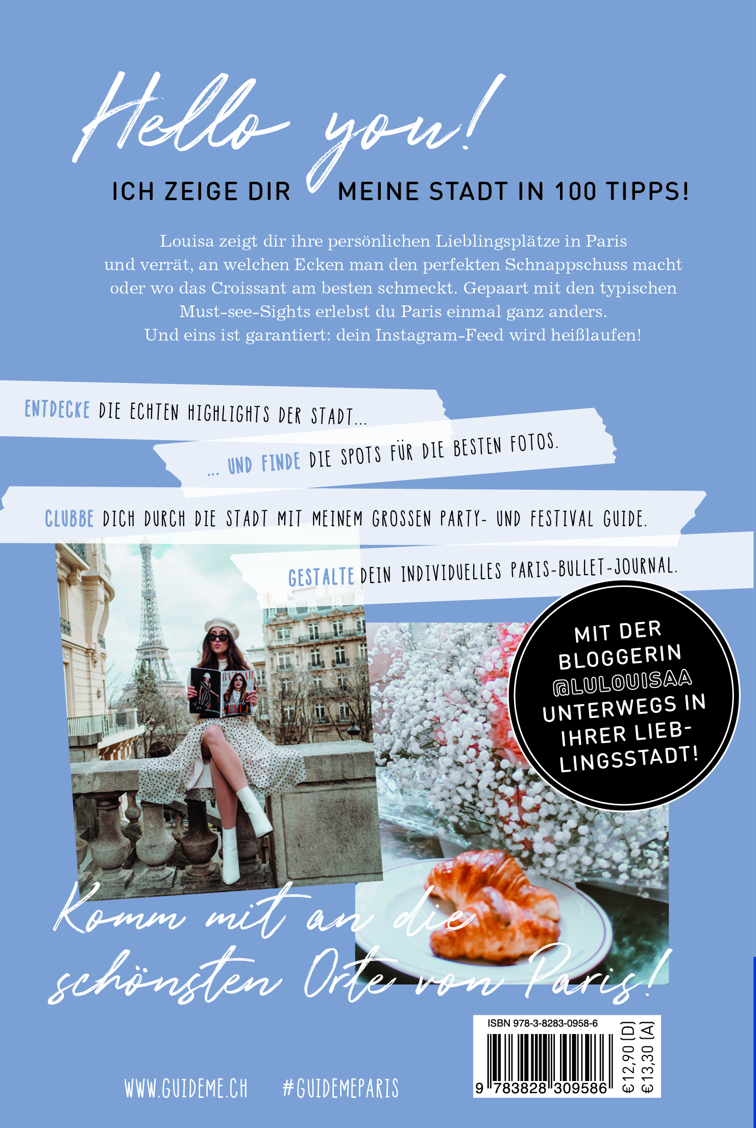 Der Reiseführer einer neuen Generation mit 100 kompakten Tipps. Die Travel-Bloggerin Louisa Löw zeigt dir ihre Lieblingsstadt Paris, und verrät an welcher Ecke man den perfekten Schnappschuss macht oder wo die Açai Bowl am besten schmeckt! Gepaart mit den typischen Must-See-Sights erlebst du Paris mit diesem Reiseführer einmal ganz anders. Und eins ist garantiert: Dein Instagram-Feed wird heißlaufen! Im modernen Design, mit individuellen Illustrationen und freien Kreativ-Seiten ist der GuideMe Reiseführer Paris dabei auch ein echter Hingucker und stylischer Begleiter. > ENTDECKE die echten Highlights der Stadt wie ein Einheimischer > FINDE die besten Spots für die schönsten Fotos > CLUBBE dich durch die Stadt mit dem großen Party- und Festival-Guide > GESTALTE dein individuelles Bullet-Journal auf freien Seiten | Blogger-Tipps | Foto-Hotspots | klassische Sehenswürdigkeiten | Restaurants & Cafés | Shopping | Clubs & Bars | Events & Festivals | Kreativ-Teil zum selber ausfüllen | freie Seiten | Reiseführer mit herausnehmbarer City-Map