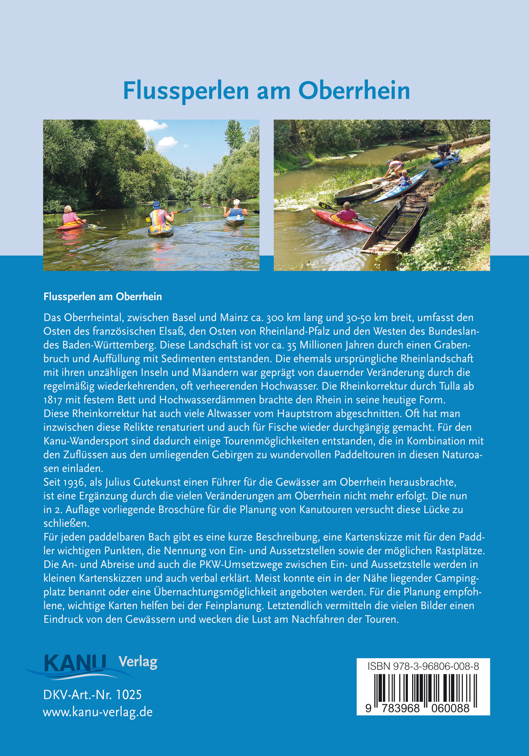 Das Oberrheintal, zwischen Basel und Mainz ca. 300 km lang und 30 - 50 km breit, umfasst den Westen des französischen Elsaß, den Osten von Rheinland-Pfalz und den Westen des Bundeslandes Baden-Württemberg. Diese Landschaft ist vor ca. 35 Millionen Jahren durch einen Grabenbruch und Auffüllung mit Sedimenten entstanden. Die ehemals ursprüngliche Rheinlandschaft mit ihren unzähligen Inseln und Mäandern, war geprägt von dauernder Veränderung durch die regelmäßig wiederkehrenden oft verheerenden Hochwasser. Die Rheinkorrektur durch Tulla ab 1817 mit festem Bett und Hochwasserdämmen brachte den Rhein in seine heutige Form. Diese Rheinkorrektur hat auch viele Altwasser vom Hauptstrom abgeschnitten. Oft hat man inzwischen diese Relikte renaturiert und auch für Fische wieder durchgängig gemacht. Für den Kanu-Wandersport sind dadurch einige Tourenmöglichkeiten entstanden, die in Kombination mit den Zuflüssen aus den umliegenden Gebirgen zu wundervollen Paddeltouren in diesen Naturoasen einladen. Seit 1963, als Julius Gutekunst einen Führer für die Gewässer am Oberrhein herausbrachte, ist eine Ergänzung durch die vielen Veränderungen am Oberrhein nicht mehr erfolgt. Die nun vorliegende Broschüre für die Planung von Kanutouren versucht diese Lücke zu schließen. Für jeden paddelbaren Bach gibt es eine kurze Beschreibung, eine Kartenskizze mit für den Paddler wichtigen Punkten, die Nennung von Ein- und Aussetzstellen sowie der möglichen Rastplätze. Die An- und Abreise und auch die PKW-Umsetzwege zwischen Ein- und Aussetzstelle werden in kleinen Kartenskizzen und auch verbal erklärt. Meist konnte ein in der Nähe liegender Campingplatz benannt oder eine Übernachtungsmöglichkeit angeboten werden. Für die Planung empfohlene, wichtige Karten helfen bei der Feinplanung. Letztendlich vermitteln die vielen Bilder einen Eindruck von den Gewässern und wecken die Lust am Nachfahren der Touren.