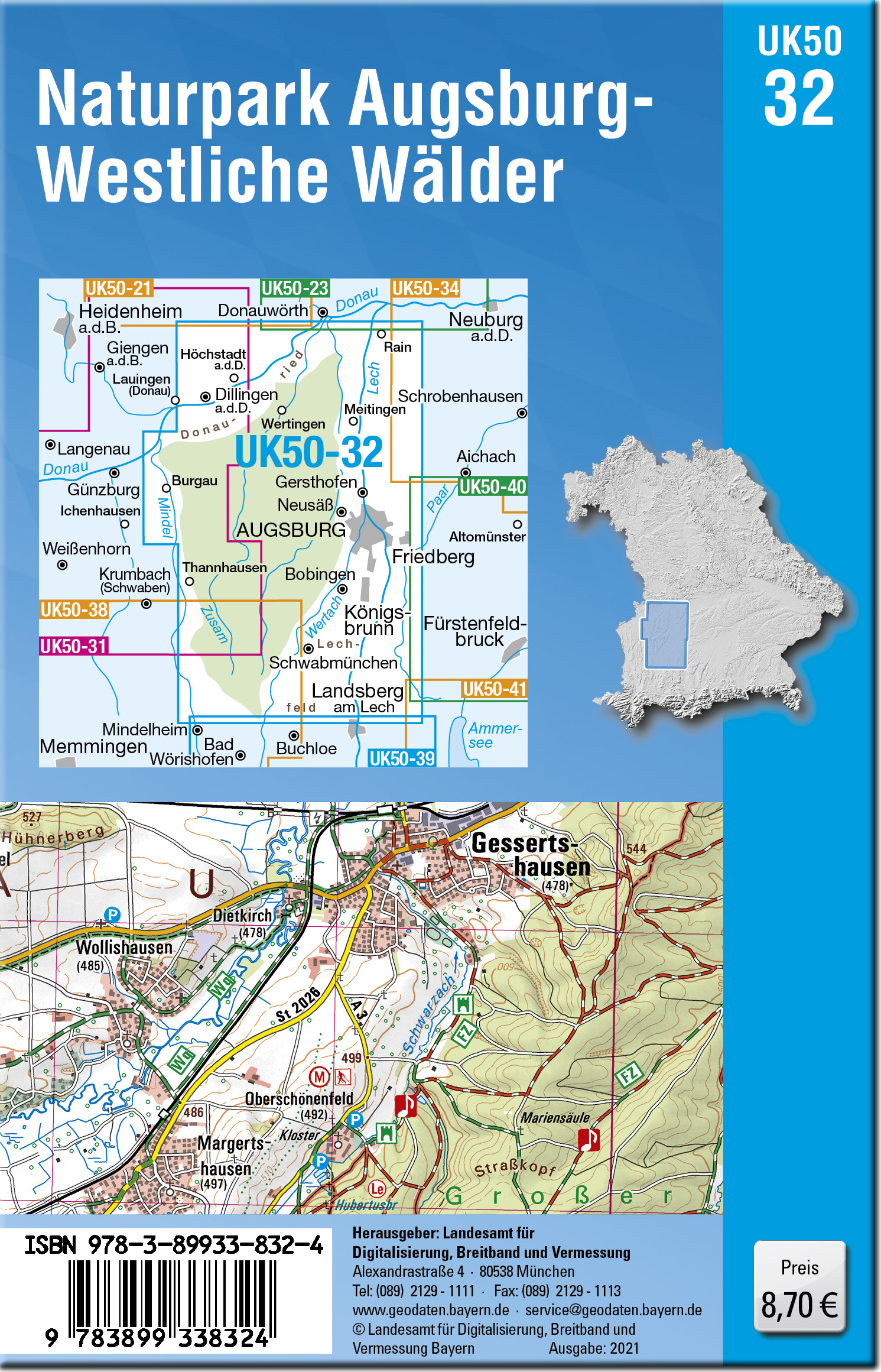 Die amtliche Reihe der UK50 (Umgebungskarte 1:50000) bietet für zusammenhängenden bayerische Regionen gezielte Freizeitinformationen.Kartengrundlage ist die TK50 (Topographische Karte 1:50000) mit UTM-Gitter für GPS-Nutzer und Geländedarstellung.Die UK50-32 zeigt die Region westlich von Augsburg, abgegrenzt durch Oberndorf am Lech im Norden und Landsberg am Lech im Süden. Die Landschaft ist geprägt durch Wälder, Hügelketten und Täler. Im schwäbischen Barockwinkel zieren prachtvolle Kirchen das Panorama. Weiter südlich dominiert die Lechfeld Ebene. Das dünnbesiedelte Donauried im Norden ist ebenfalls eben aber eher moorig. Diese abwechslungsreiche Landschaft bietet für Radler unzähligeMöglichkeiten die Region zu erkunden. Über Holzwinkel, Reischenau und die Stauden erstreckt sich der "NaturparkAugsburg-Westliche Wälder". Er ist mit seiner Vielzahl an ausgewiesenen Radwegen ein beliebtes Ausflugsziel. Ob auf einerentspannten Tour entlang der "Romantischen Straße" oder auf den Spuren von Mozarts Ahnen durch die Stauden - hier ist für jeden etwas dabei. Aber auch Wanderer kommen in dem 1.200 Quadratkilometer großen Gebiet, durchzogen von Flüssen wie Zusam und Schmutter, voll auf Ihre Kosten. Auf zahlreich erschlossenen Wanderwegen können sie in die Natur eintauchen. Dank seiner Geschichte als römische Garnisonsstadt und als freie Reichsstadt bietet Augsburg viele spannende Sehenswürdigkeiten. Besichtigt werden kann unter anderem die Fuggerei, die älteste existierende Sozialsiedlung der Welt.Kartenblatt UK50-32 Naturpark Augsburg Westliche WälderREGIONEN: Schwaben, Donauried, Holzwinkel, Reischenau, Stauden, Lechfeld, Naturpark Westliche WälderORTE: Höchstädt a.d.Donau, Rain, Wertingen, Neusäß, Gersthofen, Bobingen, Königsbrunn, Schwabmünchen, Lagerlechfeld, Stauden, Schmutter, Zusam, Wertach, Schloss Thurn, Dillingen a.d.Donau