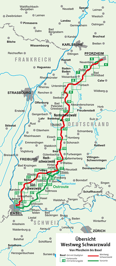 - Der Höhenweg mit einer Länge von rund 285 km ist der längste der drei Schwarzwald-Längsrouten, der "Klassiker" mit Start in Pforzheim und Ziel in Basel.