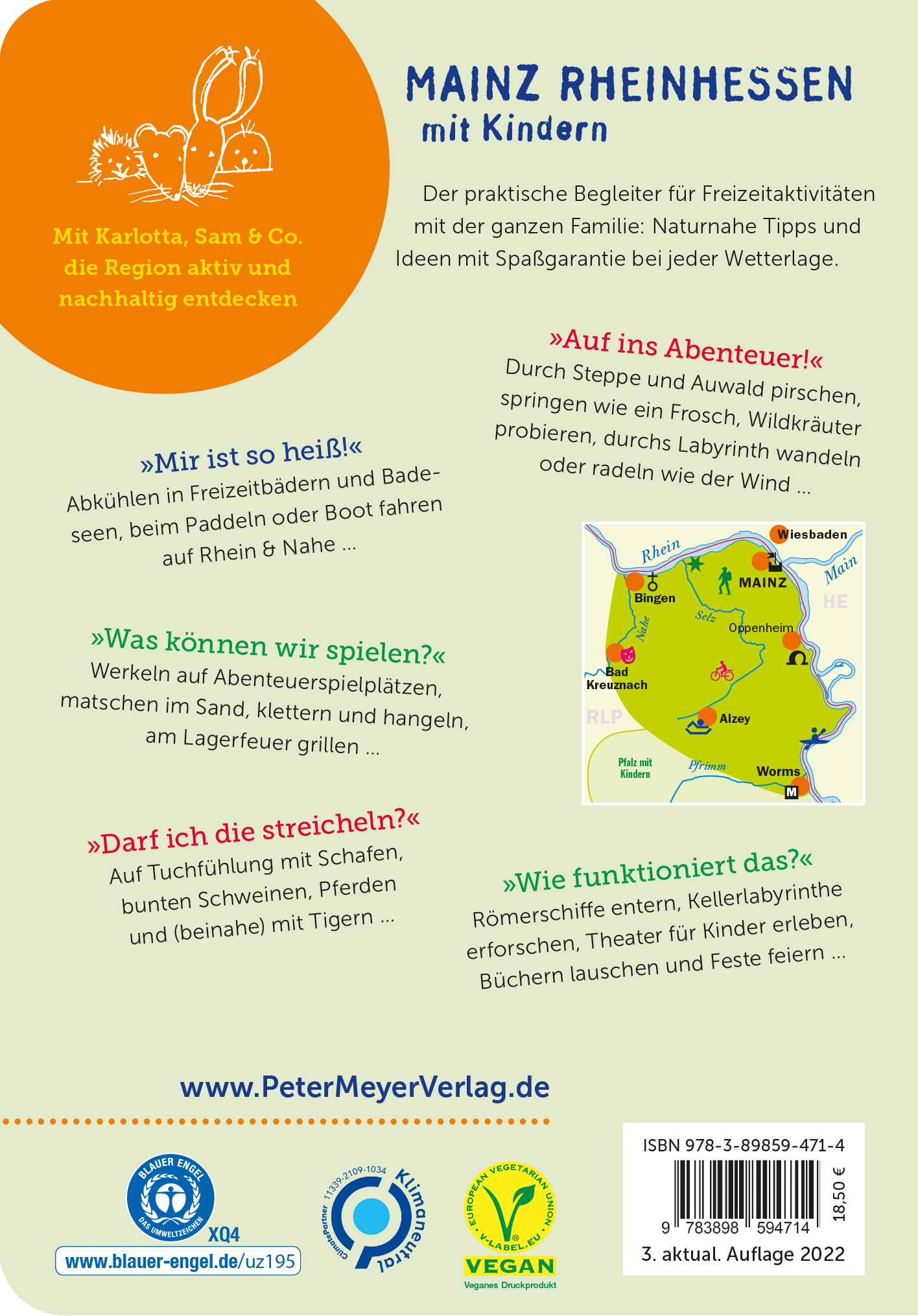 »Mama, Papa, was machen wir heute?« Wer kennt diese Frage nicht! Mit dem frisch aufgelegten Freizeitführer für Mainz und die Region um Bingen, Alzey und Worms sind die freien Tage nun gerettet. Denn bei rund 250 Ausflugstipps sind Spiel, Spaß und Spannung garantiert. Kinder von 3 bis 13 Jahre können auf Naturlehrpfaden die Lebensräume von heimischen Waldbewohnern kennen lernen, Vögel in der Aue beobachten oder im Tiergarten Flamingos, Waschbären oder Tiger bestaunen. Bei schlechtem Wetter steht eins der vielen Museen auf dem Programm. Das Buch nennt hier nicht nur die großen mit ihren spannenden Angeboten für Kinder, sondern auch die kleinen wie das Fahrrad- oder das Postmuseum. Besonders spannend ist ein Rundgang durch die Sendezentrale des ZDF, um zu erfahren wie Fernsehen gemacht wird. Ein bisschen gruseln ist bei unterirdischen Führungen durch die Katakomben von Mainz oder den Kellern von Oppenheim erlaubt.