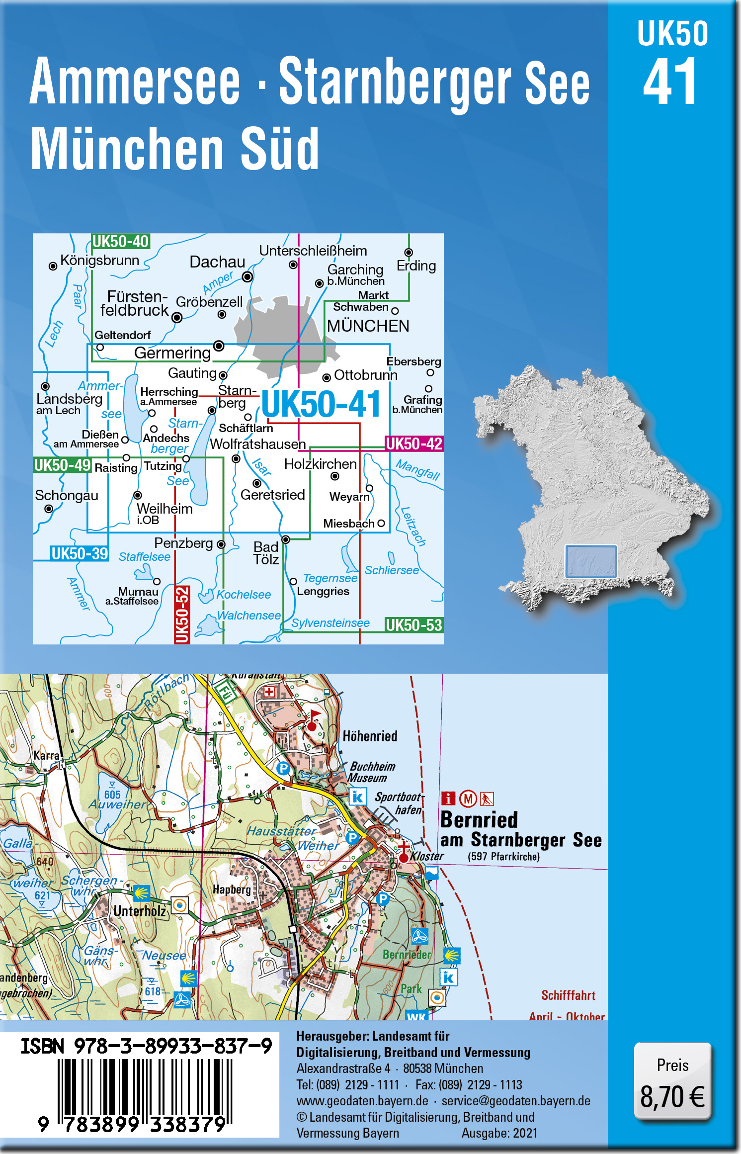 Die amtliche Reihe der UK50 (Umgebungskarte 1:50000) bietet für zusammenhängenden bayerische Regionen gezielte Freizeitinformationen.Kartengrundlage ist die TK50 (Topographische Karte 1:50000) mit UTM-Gitter für GPS-Nutzer und Geländedarstellung.Die UK50-41 präsentiert uns das Fünfseenland, den Münchner Süden mit den großen Staatsforsten und das Bayerische Oberland. Durch idyllische Naturschutzgebiete vorbei an den umliegenden Wäldern bahnt sich die Isar von Süden kommend ihren Weg Richtung München. Für Radler ist diese Landschaft ein wahres Paradies. Sie können sich hier auf ungezählten Kilometern ausgeschilderter Radwege austoben. Die zahlreichen Seen und Weiher laden zu einem Sprung ins kühle Nass ein. In einem der vielen Biergärten kann man dann seinem Körper die verlorene Flüssigkeit zurückgeben. Kloster Andechs, mit dem wohl bekanntesten Biergarten der Region, ist nur ein Highlight der vielen erlebnisreichen Ausflugsziele. Die ausgedehnten Waldgebiete südlich von München sind ideal für eine 'kurze Runde' mit dem Fahrrad und auch zu Fuß.Was bietet die Gegend noch? Kleinode der Natur wie zum Beispiel die Osterseen oder die Isar mit der Pupplinger Au. Sehr sehenswert sind die historischen Altstädte von Wolfratshausen und Weilheim i.OB mit ihrem ganz eigenen Charme und auch die Burg Grünwald. Für Kulturbegeisterte lohnt sich ein Besuch des Buchheim-Museums der Phantasie bei Bernried oder des Sissi-Schlosses in Possenhofen. Ein Muss ist zudem ein Ausflug auf die wunderschöne Roseninsel bei Feldafing derenprähistorische Pfahlbauten zum UNESCO-Weltkulturerbe gehören.Kartenblatt UK50-41 Ammersee, Starnberger See, München-SüdREGION: Oberbayern, Bayerisches Oberland, Fünfseenland, Pfaffenwinkel, Forstenrieder Park, Grünwalder Forst, Hofoldinger ForstORTE: Starnberg, Grünwald, Wolfratshausen, Geretsried, Holzkirchen, Weilheim i.OB, Herrsching a.Ammersee, Dießen a.Ammersee, Germering, Miesbach, Hohenpeißenberg, Wörthsee, Kloster Andechs, Kloster Schäftlarn, Gauting, Ottobrunn, Tutzing, Roseninsel, Feldafing