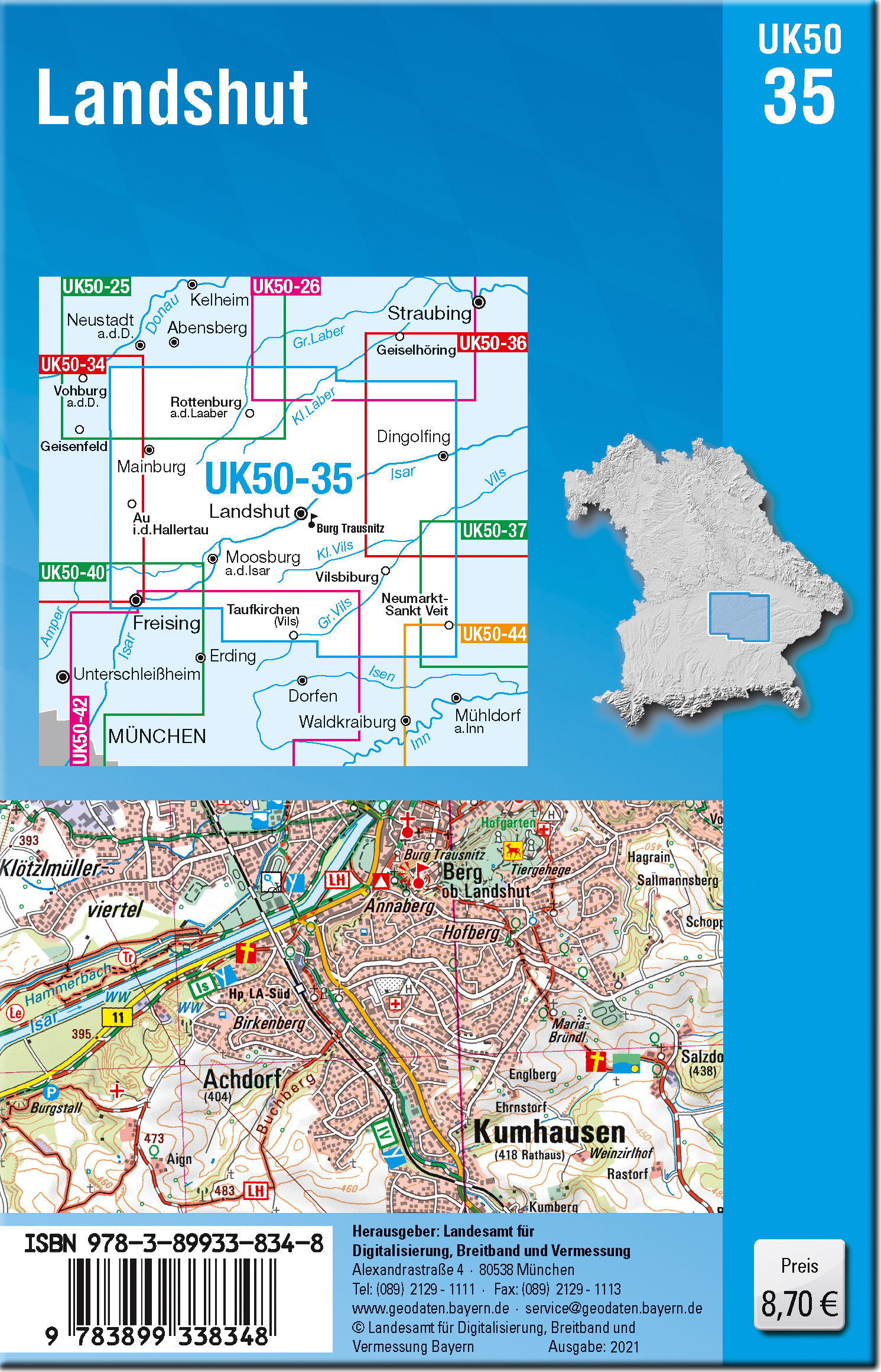Die amtliche Reihe der UK50 (Umgebungskarte 1:50000) bietet für zusammenhängenden bayerische Regionen gezielte Freizeitinformationen.Kartengrundlage ist die TK50 (Topographische Karte 1:50000) mit UTM-Gitter für GPS-Nutzer und Geländedarstellung.Der Landkreis Landshut, der in dieser Karte jetzt vollständig dargestellt wird, hat einiges zu bieten. Zuallererst natürlich Landshut selbst, heute Sitz der Bezirksregierung, früher Wittelsbacher-Residenz. Aus dieser Zeit stammen Burg Trausnitzund die Stadtresidenz, der erste Renaissancepalast nördlich der Alpen, mit italienischem Flair, und natürlich die"Landshuter Hochzeit 1475", die alle 4 Jahre aufgeführt wird. In stetem Wettstreit zum Herzog standen die Bürger Landshuts, was man an den prächtigen Fassaden der Altstadt und der St.-Martins-Kirche (höchster Backsteinturm der Welt!) erkennen kann. Mit dem Rad erreicht man isarabwärts die Auto-Stadt Dingolfing und flussauf Freising, die alte fürstbischöfliche Residenz mit seiner schmucken Altstadt und dem sehenswerten Ensemble auf dem Domberg. Auch dieTäler von Abens, Laber, Vils und Rott lassen sich bequem erkunden. Der sportlichere Radler traut sich ins hügelige Umland, stößt in Rottenburg a.d.Laaber, Neumarkt-St.Veit oder Vilsbiburg auf historische Ortskerne und im Nordwesten auf die Hallertau. Für Pilger und Fernwanderer bietet sich der Wolfgangweg an.Kartenblatt UK50-35 LandshutREGION: Hallertau, mittlere Isar, HolzlandORTE: Freising, Dingolfing, Mainburg, Neumarkt-Sankt-Veit, Rottenburg a.d.Laaber, Moosburg a.d.Isar, Taufkirchen (Vils)