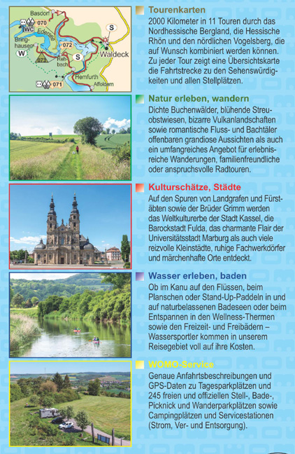 Liebe Leserin, lieber Leser, wir möchten Sie diesmal in einen Teil unserer hessischen Heimat mitnehmen und Ihr Interesse für einen mit eindrucks- vollem Charme ausgezeichneten Landstrich wecken! Im Herzen Deutschlands gelegen, bietet die Mittelgebirgs- landschaft eine abwechslungsreiche Kulisse für Wanderungen und Radtouren entlang munter plätschernder Bäche, großer Flüsse und an Stauseen. Die typische, leicht gewellte Hügellandschaft ist aber auch die Heimat der Brüder Grimm, die in den malerischen Fachwerk- städtchen und den dichten Wäldern mit romantischen Burgen ihre weltberühmten Kinder- und Hausmärchen sammelten. Im Schwälmer Rotkäppchenland, im Schneewittchendorf Berg- freiheit und am Frau-Holle-Teich auf dem Hohen Meißner wird diese Welt der Märchen und Sagen lebendig, aber auch das Waldecker Land oder das Hinterland locken mit vielfältigen Attraktionen für große und kleine Urlauber. Mittendrin liegt die nordhessische Metropole Kassel, die außer einer großen Geschichte, alte sowie moderne Kunst zeigt und deren Bergpark Wilhelmshöhe dem sagenhaften Herkules zu Füßen liegt. Weiter südlich gelangen wir an der Lahn in die traditionsrei- che Universitätsstadt Marburg mit der traumhaften Silhouette des Landgrafenschlosses. Wir reisen über den nördlichen Teil des nach Fläche und Masse größten Vulkans Europas, den Vogelsberg, der von weiten, baumbestandenen Wiesen sowie massigen Blocksteinfeldern als auch bizarren Basalt- klippen geprägt ist. Die Barockstadt Fulda bildet das Tor ins Land der offenen Fernen, das uns in der Rhön mit unbewaldeten Kuppen, lieblichen Tälern und Mooren erwartet. Begleiten Sie uns in eine wohnmobilfreundliche Region, die mit der Verknüpfung von Unesco-Naturerbe im Kellerwald, dem Unesco-Dokumentenerbe der Märchen der Brüder Grimm und dem Unesco-Kulturerbe im Bergpark Wilhelmshöhe einen reichen Schatz an wunderbarer Natur und Kultur zu bieten hat! Wir wünschen Ihnen viele schöne Reiseerlebnisse und eine angenehme Urlaubszeit Ihre Anette Scharla-Dey und Franz Peter Tschauner