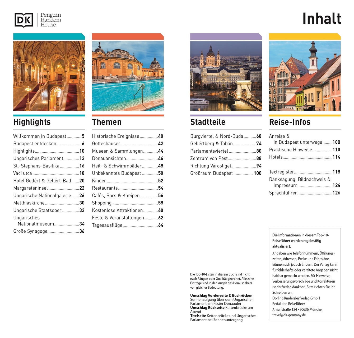 Mittelalterliche Straßen, kaiserliche Paläste und prachtvolle Bäder in Buda sowie das muntere Treiben in Pest mit dem lebhaften Shopping- und Unterhaltungsviertel Váci utca macht die Faszination der Donaumetropole aus. Entdecken Sie mit dem Top 10 Budapest die verschiedenen Facetten der ungarischen Hauptstadt. Alle Sightseeing-Highlights für Ihre Städtereise finden Sie hier im einprägsamen Top-10-Listen-Format wunderbar übersichtlich präsentiert. Dieser Budapest-Reiseführer macht Ihren Aufenthalt unvergesslich!