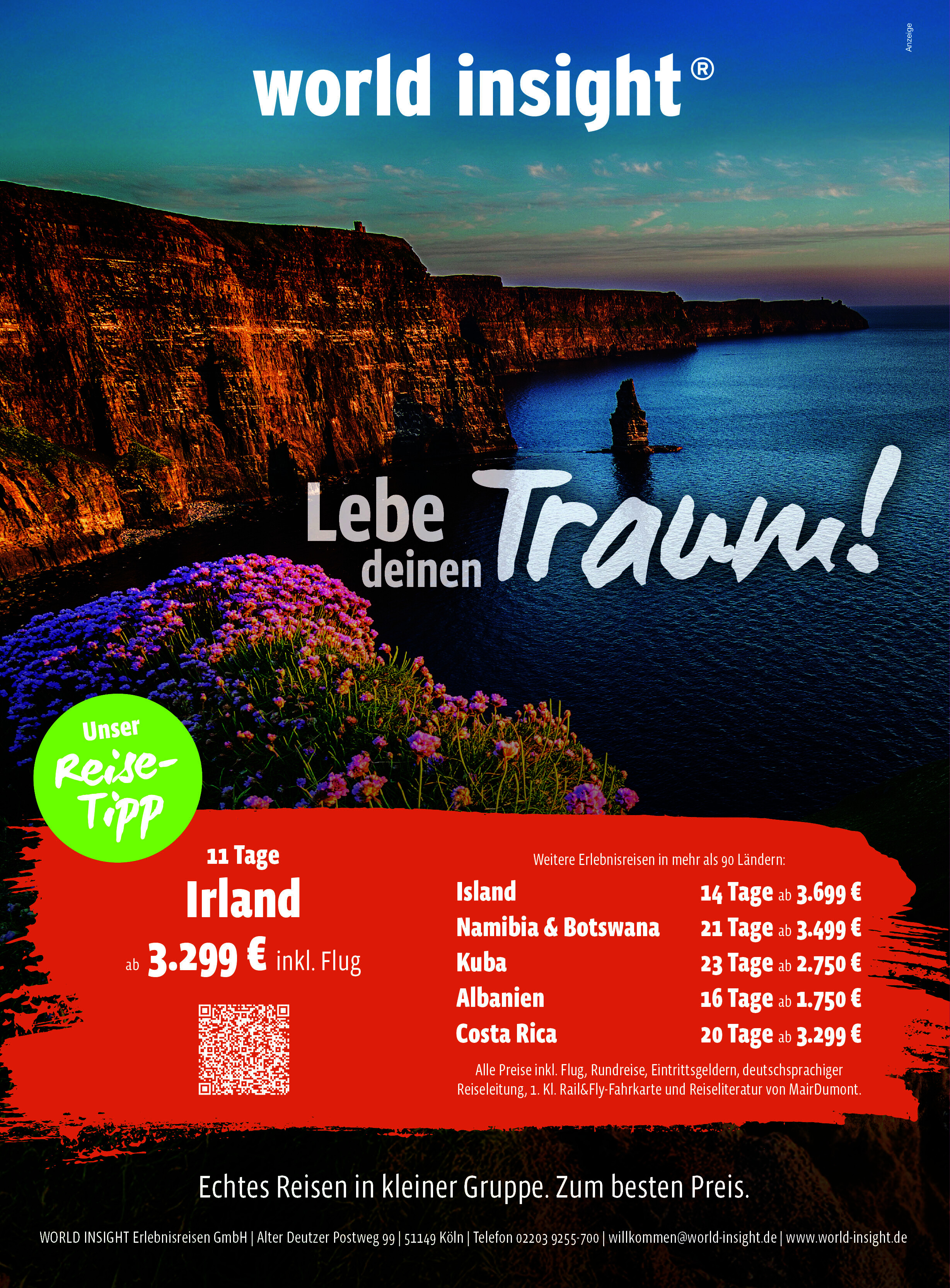 | Schlagworte | Antrim Coast • Aran Islands • Cliffs of Croaghaun • Cliffs of Moher • Cliffs of Slieve League • Connemara • Cork • County Kildare • Dublin • Fastnet Rock • Ganggrab von Newgrange • Garinish Island • Giant&apos • Giant´s Causeway • Kilcullen&apos • Kilkenny • Killarney Area • Killarney National Park • Monasterboice • National Museum Archaeology • Powerscourt Gardens • Ring of Kerry • Rock of Cashel • s Causeway • Shannon Callows • Skellig Michael • s Seaweed Bath • Ulster American Folk Park • Wicklow Gardens |