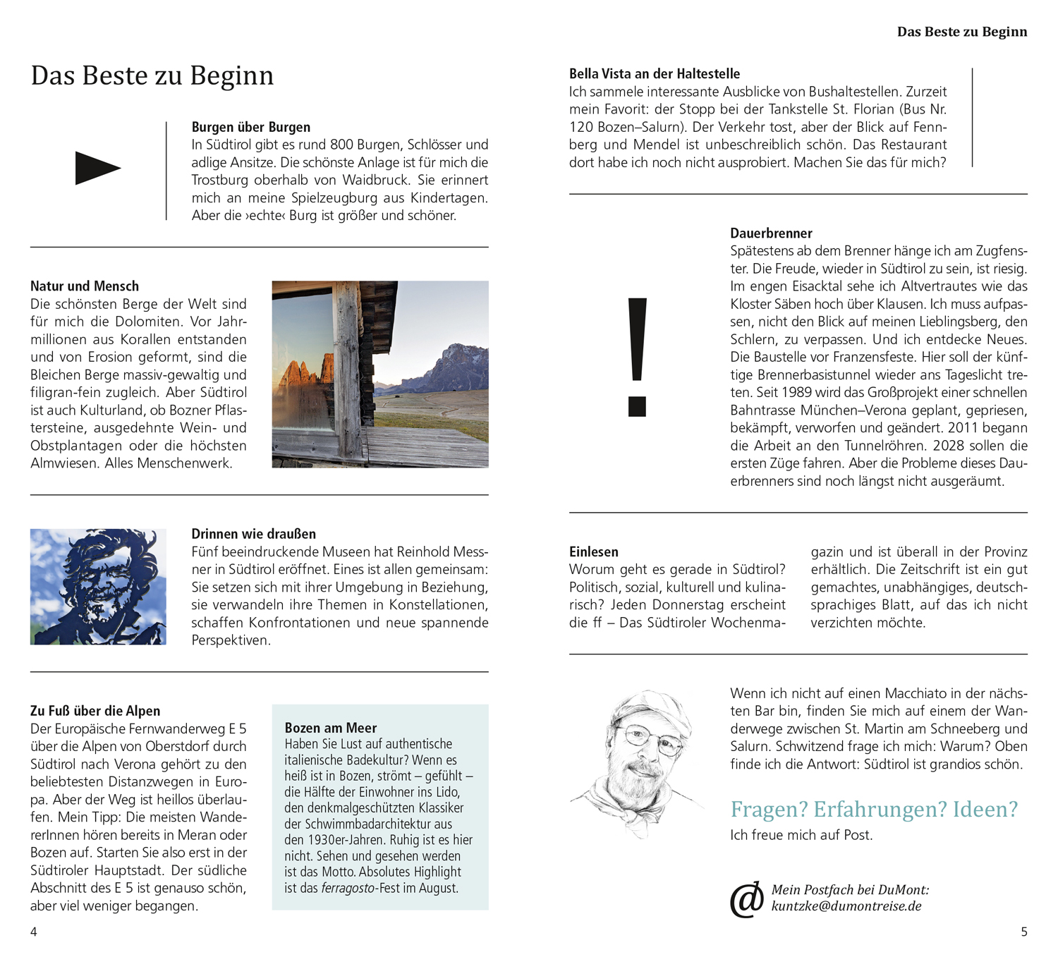 Das Beste zu Beginn. Das ist Südtirol. Südtirol in Zahlen. So schmeckt Südtirol. Ihr Südtirol-Kompass: Das Eisacktal bis Bozen, Das Pustertal bis Osttirol, Bozen und der Süden, Meraner Land und Vinschgau. Hin & weg. O-Ton Südtirol. Kennen Sie die?