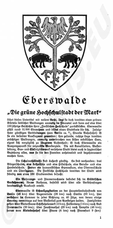Auf der oberen Vorderseite ist ein historischer Stadtplan Eberswalde im Maßstab 1: 12 500 inkl. dazugehörigem Straßenverzeichnis. Eine historische Wanderkarte befindet sich auf der unteren Vorderseite, die Wandlitz im Westen bis nach Bad Freienwalde im Osten erfasst.