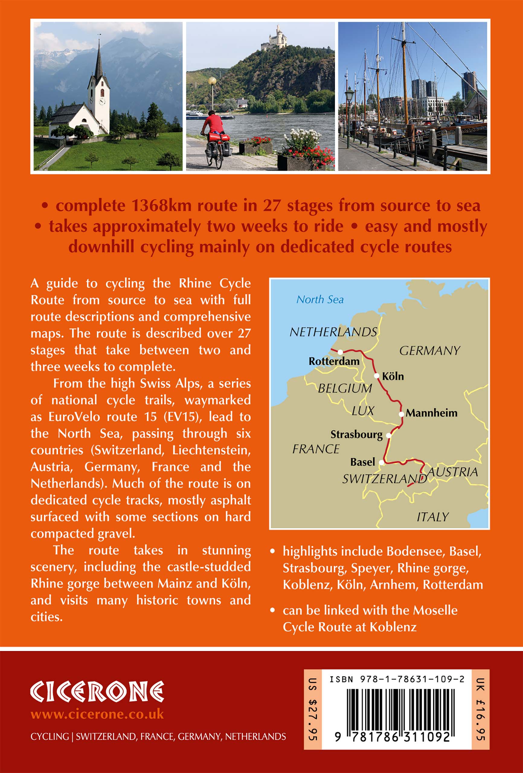 Guidebook to cycling-touring the river Rhine from its source high in the Swiss Alps, through Germany and the Netherlands to the North Sea. This mostly downhill 850-mile (1368km) trail follows EuroVelo route 15, and is ideal for cyclists with limited experience of touring, as well as seasoned long-distance cyclists.