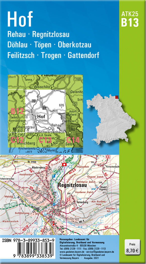 Wer es genau wissen will, greift zur ATK25. Diese Kartenserie im Maßstab 1:25000 bildet mit ihrer detaillierten Darstellung das komplette Verkehrsnetz mit allen Straßen und Wegen ab.237 Einzelblätter stellen Bayern flächendeckend dar. Ein Kartenblatt umfasst ca. 21 km x 22 km.Was bietet die ATK25?- individuelle Freizeitgestaltung mit allen ausgeschilderten Wander- und Radwanderwegen- sichere Orientierung auch abseits der markierten Routen- umfangreiches Spektrum an Freizeiteinrichtungen und Sehenswürdigkeiten- anschauliche Wiedergabe der GeländeformenKartenblatt ATK25-B13 Hof:REGION: Oberfranken, Frankenwald, Fichtelgebirge, VogtlandORTE: Rehau, Regnitzlosau, Döhlau, Töpen, Oberkotzau, Feilitzsch, Trogen, Gattendorf, Untertriebel, Schwarzenbach a.d. Saale Nord