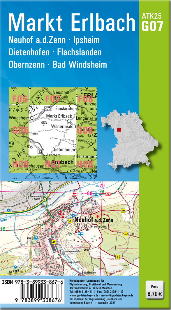 Wer es genau wissen will, greift zur ATK25. Diese Kartenserie im Maßstab 1:25000 bildet mit ihrer detaillierten Darstellung das komplette Verkehrsnetz mit allen Straßen und Wegen ab.237 Einzelblätter stellen Bayern flächendeckend dar. Ein Kartenblatt umfasst ca. 21 km x 22 km.Was bietet die ATK25?- individuelle Freizeitgestaltung mit allen ausgeschilderten Wander- und Radwanderwegen- sichere Orientierung auch abseits der markierten Routen- umfangreiches Spektrum an Freizeiteinrichtungen und Sehenswürdigkeiten- anschauliche Wiedergabe der GeländeformenKartenblatt ATK25-G07 Markt Erlbach:REGION: Mittelfranken, Frankenhöhe, Windheimer Bucht, AischgrundORTE: Neuhof a.d. Zenn, Ipsheim, Dietenhofen, Flachslanden, Obernzenn, Bad Windsheim, Treutskirchen, Oberdachstetten