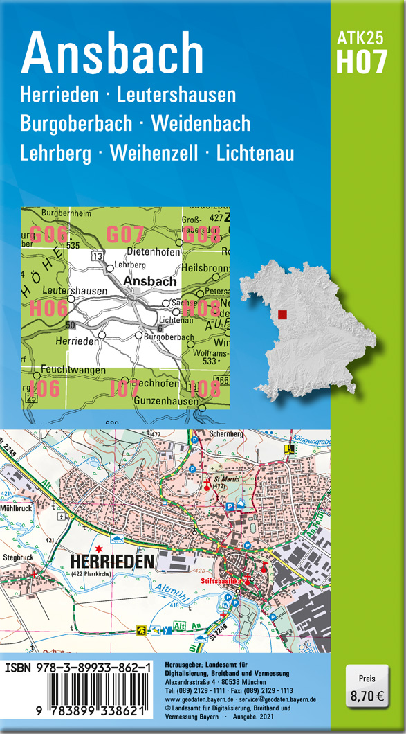 Wer es genau wissen will, greift zur ATK25. Diese Kartenserie im Maßstab 1:25000 bildet mit ihrer detaillierten Darstellung das komplette Verkehrsnetz mit allen Straßen und Wegen ab.237 Einzelblätter stellen Bayern flächendeckend dar. Ein Kartenblatt umfasst ca. 21 km x 22 km.Was bietet die ATK25?- individuelle Freizeitgestaltung mit allen ausgeschilderten Wander- und Radwanderwegen- sichere Orientierung auch abseits der markierten Routen- umfangreiches Spektrum an Freizeiteinrichtungen und Sehenswürdigkeiten- anschauliche Wiedergabe der GeländeformenKartenblatt ATK25-H07 Ansbach:REGION: Mittelfranken, FrankenhöheORTE: Herrieden, Leutershausen, Burgoberbach, Weidenbach, Lehrberg, Weihenzell, Lichtenau, Sachsen b. Ansbach