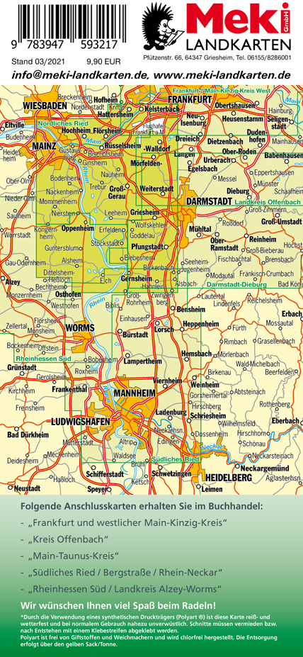 Maßstab 1:30.000 - reißfest und wetterfest - Von Kelsterbach bis Gernsheim und von Mainz bis Darmstadt - Mit ADFC-Tourenvorschlägen - Mit allen beschilderten Radwegen und mehr - UTM-Koordinaten für GPS-Nutzer*innen - + Beilage ADFC-Tourenbeschreibung