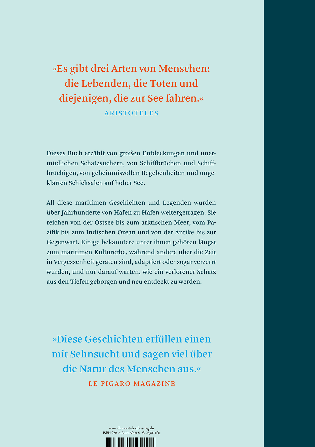 Die Geschichten reichen vom Atlantischen bis zum Pazifischen Ozean, von der Ostsee bis zur Karibik und von der Antike bis zur Gegenwart. Sie wurden über Jahrhunderte von Hafen zu Hafen weitergetragen und handeln von mutigen Seglern, modernen Piraten, Meerjungfrauen und Pharaonen. Einige bekanntere unter ihnen wie etwa die Sage vom Fliegenden Holländer gehören längst zum maritimen Kulturerbe, während andere über die Zeit in Vergessenheit geraten sind, adaptiert oder sogar verzerrt wurden, und nur darauf warten, wie ein verlorener Schatz aus den Tiefen geborgen und neu entdeckt zu werden.