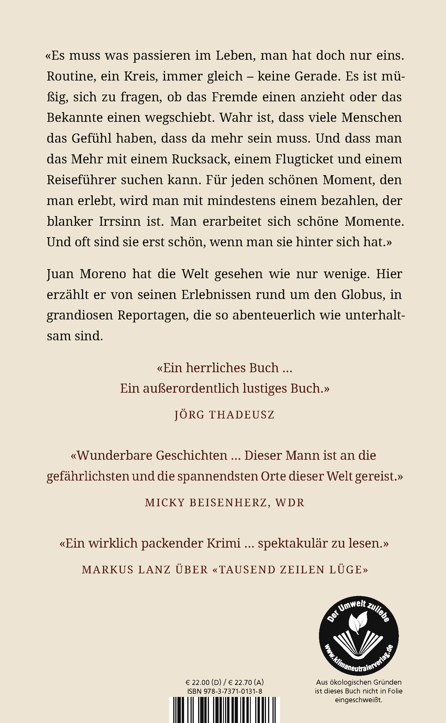 Juan Morenos Geschichten von unterwegs sind eine großartige Lektüre, überraschend, dramatisch, packend. Moreno fährt viertausend Kilometer quer durch Europa mit einem Kleinbus voller Arbeitsmigranten, spricht mit einem Killer Pablo Escobars über Auftragsmord und mit Mike Tyson über Schmerz und Ruhm. Mit kubanischen Fischern fährt er aufs Meer, und er überlebt die gefährlichste Flüchtlingsroute der Welt, den Darién Gap. Als er eine Auszeit braucht, geht er ein Jahr lang auf Weltreise. Aber das Abenteuer wartet auf den, der es versteht, auch anderswo: ob zu Hause, bei den frommen Pilgern auf dem Jakobsweg oder in der Heimat Spanien. Dies alles erzählt Moreno in dem typischen Sound, der ihm seit Jahren eine große Leserschaft sichert: mit Witz und Tiefgang, stilistisch elegant und scharf beobachtet.