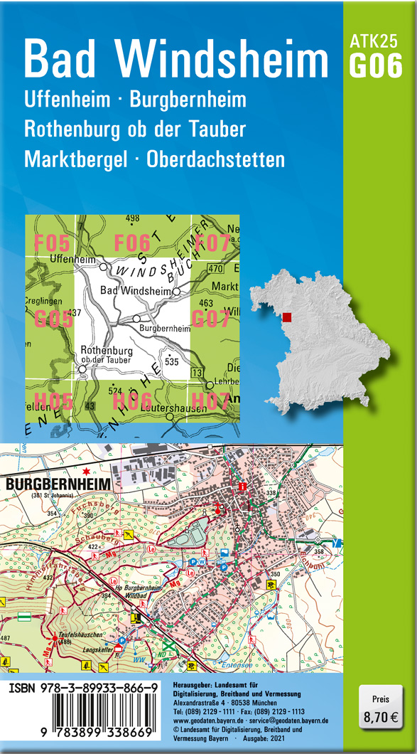 Wer es genau wissen will, greift zur ATK25. Diese Kartenserie im Maßstab 1:25000 bildet mit ihrer detaillierten Darstellung das komplette Verkehrsnetz mit allen Straßen und Wegen ab.237 Einzelblätter stellen Bayern flächendeckend dar. Ein Kartenblatt umfasst ca. 21 km x 22 km.Was bietet die ATK25?- individuelle Freizeitgestaltung mit allen ausgeschilderten Wander- und Radwanderwegen- sichere Orientierung auch abseits der markierten Routen- umfangreiches Spektrum an Freizeiteinrichtungen und Sehenswürdigkeiten- anschauliche Wiedergabe der GeländeformenKartenblatt ATK25-G06 Bad Windsheim:REGION: Mittelfranken, Steigerwald, Windsheimer Bucht, FrankenhöheORTE: Bad Windsheim, Uffenheim, Burgbernheim, Rothenburg ob der Tauber, Marktbergel, Oberdachstetten, Ergersheim