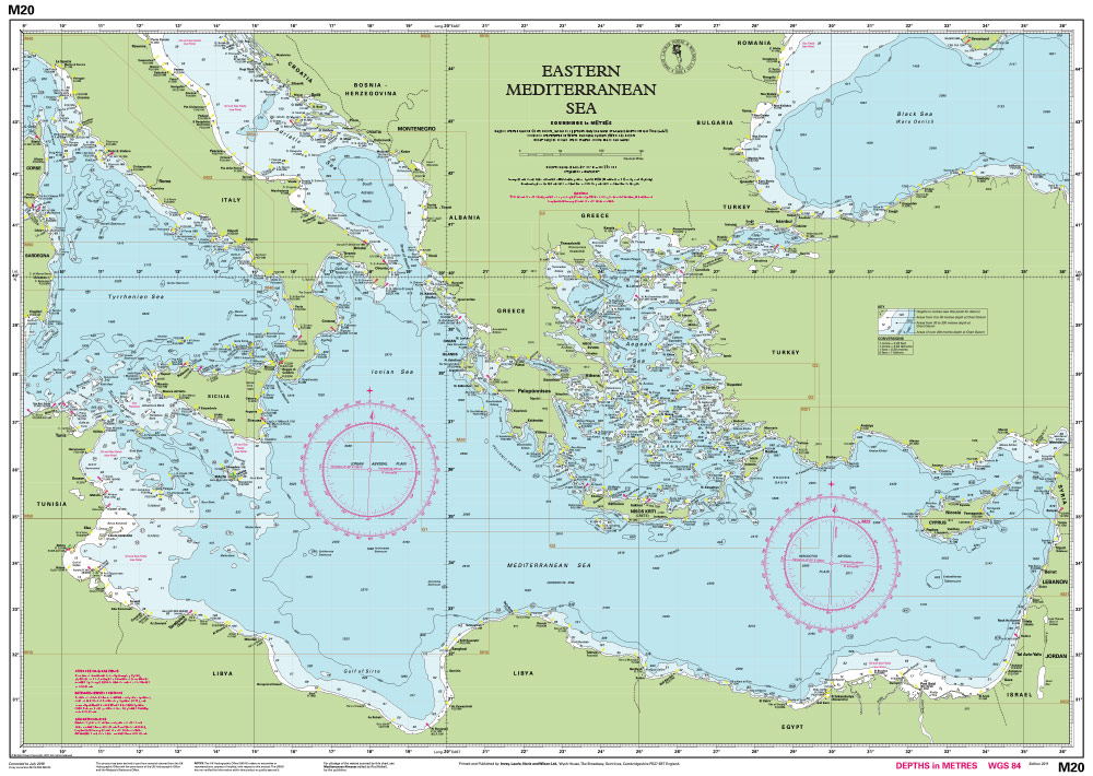 A passage planning chart covering Sardegna to Port Said and the Black Sea. On this edition the magnetic variation curves have been updated with the latest data. There has been general updating throughout.