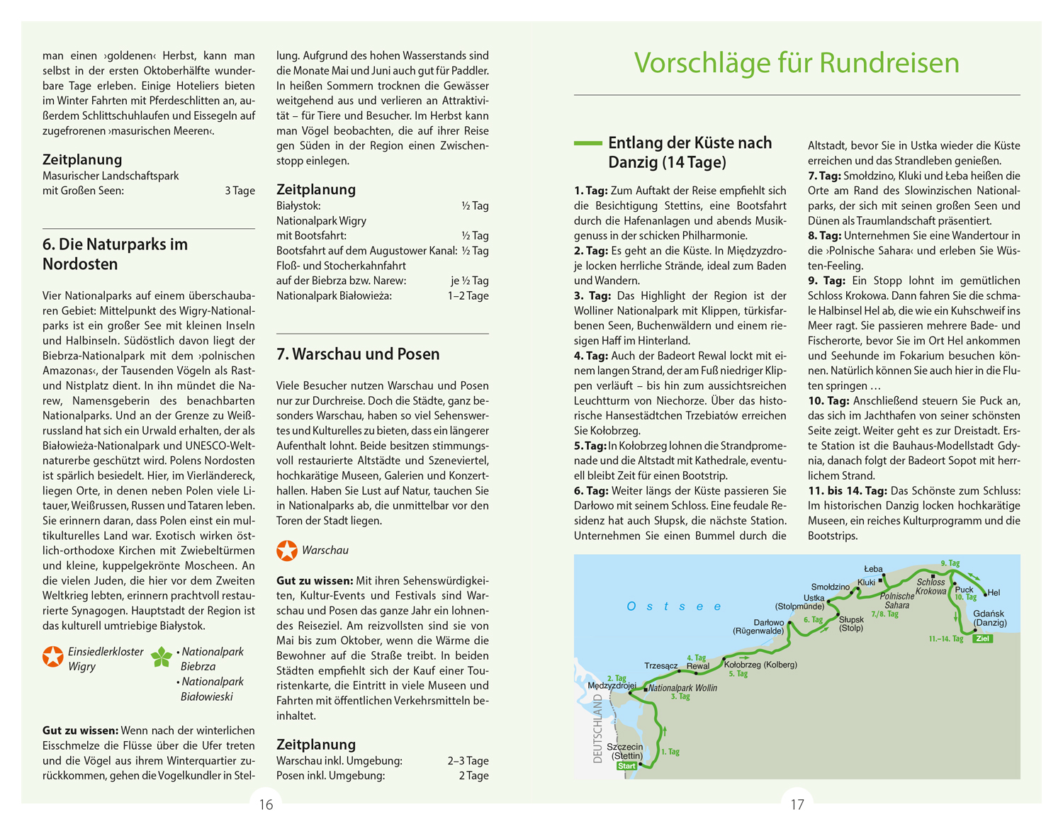 - Stettin und die Odermündung, mittlere Ostseeküste und Kaschubei, von Danzig nach Toru, vom Frischen Haff nach Olsztyn, Masuren, die Naturparks im Nordosten, Warschau und Posen