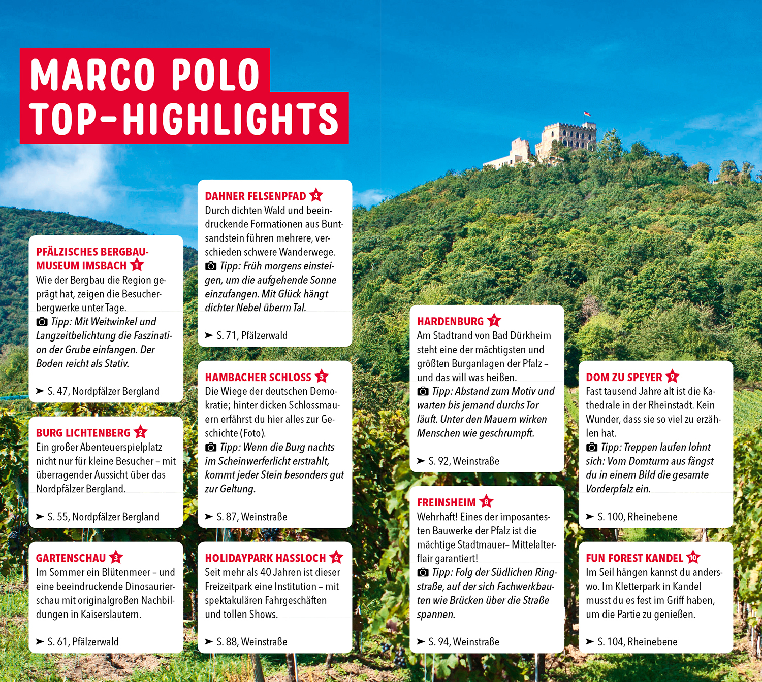 - Wandern, Wellness, Weinproben: Mit den MARCO POLO Insider-Tipps entdeckst du, was die Pfälzer an ihrer Heimat lieben