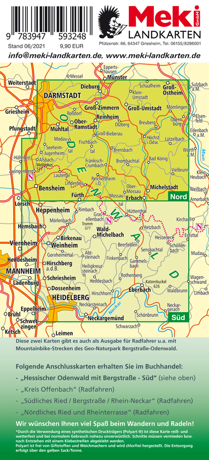 Wanderkarte des Hessischen Odenwalds mit Bergstraße, Teil Nord; von Dieburg bis Erbach und von Zwingenberg bis Obernburg.Alle in der Natur markierten Wanderwege.Mit dem kompletten "Alemannenweg", dem "Burgensteig Bergstraße" von Darmstadt-Eberstadt bis Bensheim und dem "Nibelungensteig" von Zwingenberg bis Ober-Ostern - Qualitätswege Wanderbares Deutschland.Maßstab 1:30.000. Gedruckt auf reißfestem und wetterfestem Druckträger.