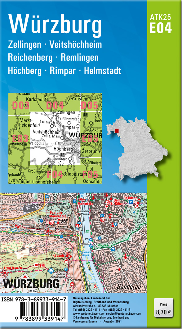 Wer es genau wissen will, greift zur ATK25. Diese Kartenserie im Maßstab 1:25000 bildet mit ihrer detaillierten Darstellung das komplette Verkehrsnetz mit allen Straßen und Wegen ab.237 Einzelblätter stellen Bayern flächendeckend dar. Ein Kartenblatt umfasst ca. 21 km x 22 km.Was bietet die ATK25?- individuelle Freizeitgestaltung mit allen ausgeschilderten Wander- und Radwanderwegen- sichere Orientierung auch abseits der markierten Routen- umfangreiches Spektrum an Freizeiteinrichtungen und Sehenswürdigkeiten- anschauliche Wiedergabe der GeländeformenKartenblatt ATK25-E04 Würzburg:REGION: Unterfranken, MaindreieckORTE: Würzburg, Zellingen, Veitshöchheim, Reichenberg, Remlingen, Höchberg, Rimpar, Helmstadt