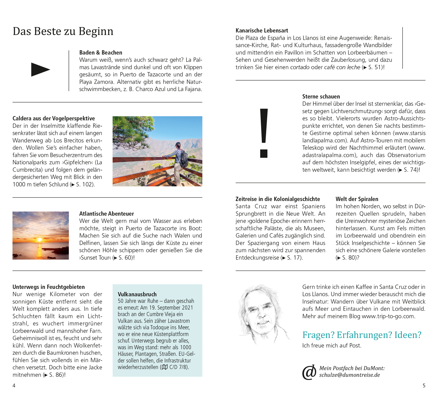 Das Beste zu Beginn. Das ist La Palma. La Palma in Zahlen. So schmeckt La Palma. Ihr La Palma-Kompass: Santa Cruz und der Südosten, der Südwesten, der Nordwesten, der Norden und der Nordosten sowie das Zentrum. Hin & Weg. O-Ton La Palma. Kennen Sie die?