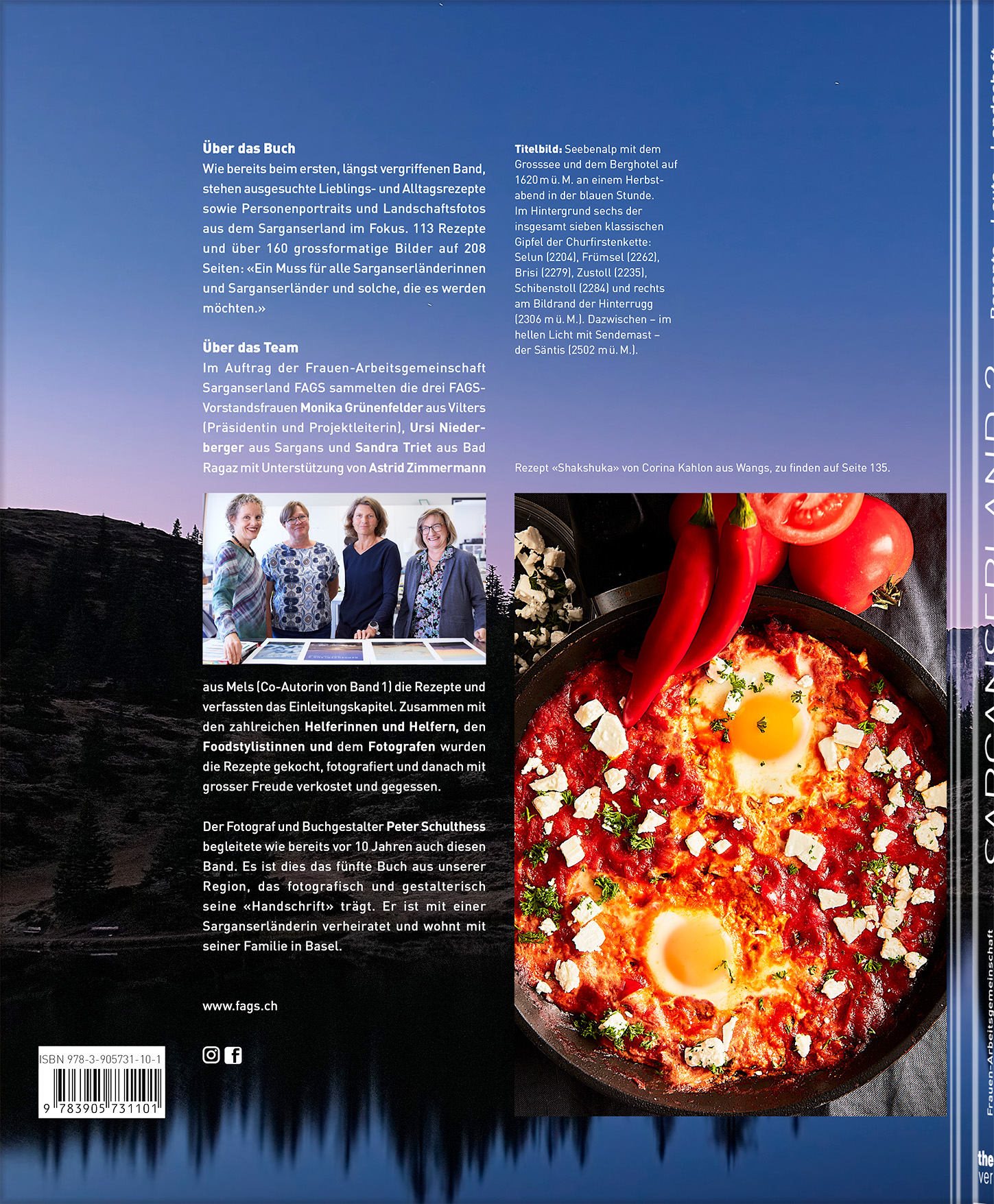 Wie bereits beim ersten, längst vergriffenen Band, stehen ausgesuchte Lieblings- und Alltagsrezepte sowie Personenportraits und Landschaftsfotos aus dem Sarganserland im Fokus. 113 Rezepte und über 160 grossformatige Bilder auf 208 Seiten: «Ein Muss für alle Sarganserländerinnen und Sarganserländer und solche, die es werden möchten.»