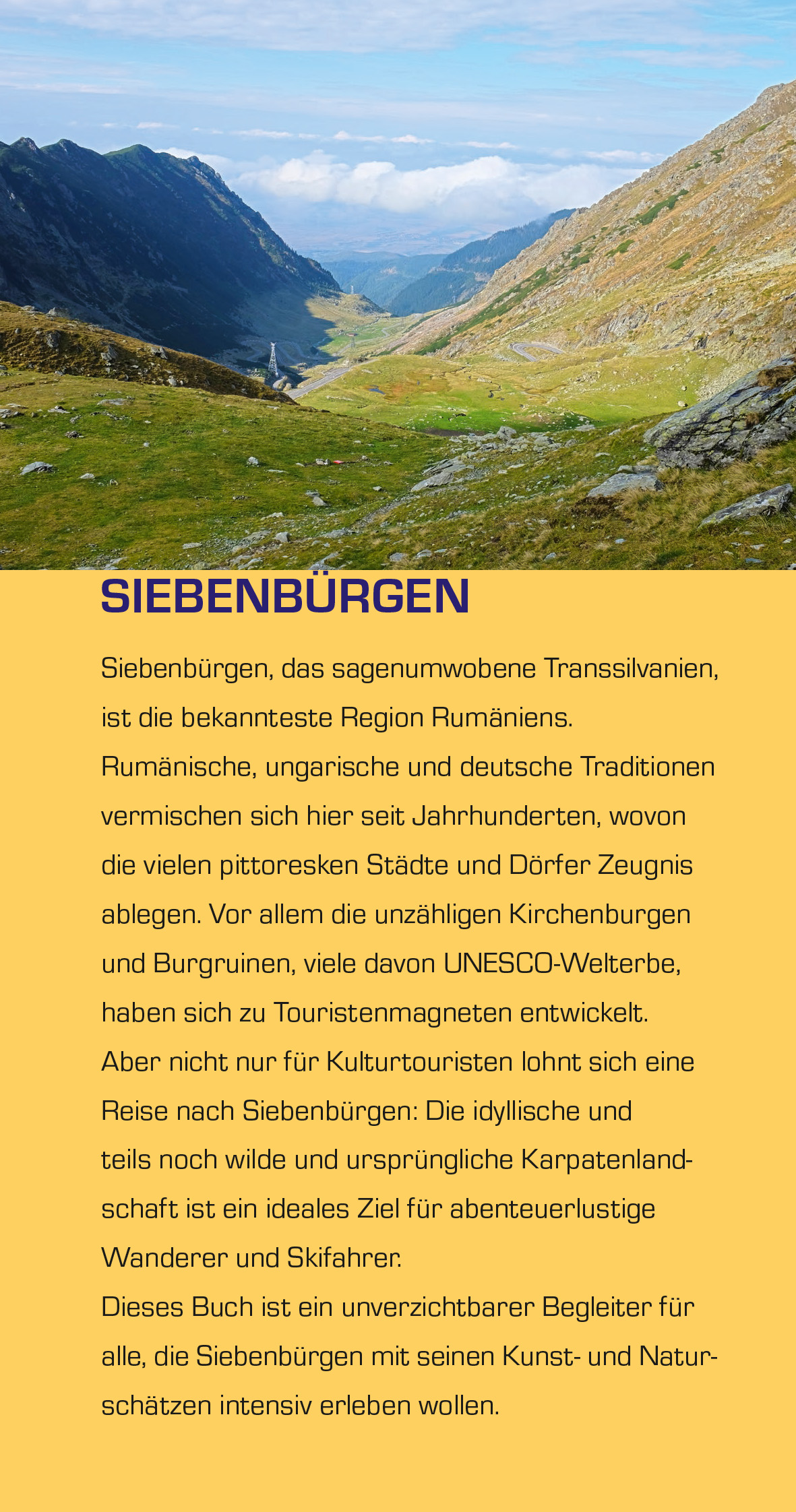 VORWORTSiebenbürgen, auch Transsilvanien genannt, ist sicherlich im deutschsprachigen Raum die bekannteste Region Rumäniens. Zum einen wegen der Siebenbürger Sachsen, die vor etwa 850 Jahren dort zu siedeln begannen, zum anderen aber auch wegen der dort lebenden Ungarn und der zeitweiligen Zugehörigkeit zum Habsburger Reich und nicht zuletzt natürlich wegen des sagenumwobenen Grafen Dracula. Die Daker konnten hier ein eigenes Reich etablieren und auch die Römer, angezogen von Gold, Silber, Erzen und Salzen, hinterließen ihre Spuren.Eine unglaubliche Dichte an Kirchenburgen, Holzkirchen und mittelalterlichen Städtchen bietet auf kleinem Raum viele Sehenswürdigkeiten, die eine Reise wert sind; viele davon zählen zum Weltkulturerbe. Die vielfältigen Anstrengungen des rumänischen Staates, die Unterstützung aus dem Ausland, auch von den ausgewanderten Sachsen, und die ungemein ideenreichen Privatinitiativen haben Wirkung gezeigt und viele Baudenkmäler vor weiterem Verfall gerettet.Die noch immer dicht bewaldeten und doch sichtbar gefährdeten Karpaten umfangen dieses Gebiet wie einen Schutzmantel. Nationalparks - in Gebirgen mit herausfordernden Gipfeln, steilen Felswänden, spektakulären Höhlen und Schluchten, aber auch sanfte Hügellandschaften - bergen botanische Raritäten und eine vielfältige Tier- und Vogelwelt. Wilde Wasserläufe, Gletscher-, Krater- und Stauseen bereichern das Bild der Naturschönheiten. Streusiedlungen, einsame Weiler und intakte Dorfstrukturen laden zu beschaulichen Ferien ein.Vieles ist weniger reglementiert als in westlichen Ländern, was Picknicken, freies Campen, Fischen, Kutsch- und Floßfahrten, Klettern in weniger gesicherten Höhlen überall ermöglicht, wo es beliebt und gefällt. Leider geht damit ein nicht immer sorgfältiger Umgang mit der Natur einher, der vielfach zu Müllhalden und verstreuten Picknickresten führt. Die rumänische Bergwacht Salvamont unternimmt aber große Anstrengungen, um diesem Übel entgegenzutreten.Die touristische Infrastruktur hat sich in den letzten Jahren stetig weiterentwickelt. Schlechte Straßen und fehlende Beschilderung sind eher selten geworden. Mit EU-Unterstützung wurde in jüngster Zeit ein dichtes Netz an Informations-Pavillons installiert, in denen meist kompetent beraten und gutes Material bereitgehalten wird.In den Städten hat man bei den Hotels in der Regel die Wahl zwischen großen, modernen Neubauten, die keine Wünsche offen lassen, und kleineren, charmanten Hotels in historischen Gemäuern. Auf dem Land locken beschauliche Unterkünfte in mit Hingabe und Einfallsreichtum renovierten Dorfhäusern.Die historischen Zentren der prosperierende Städte wie Sibiu (Hermannstadt), Bra_ov (Kronstadt) und Sighi_oara (Schäßburg) gleichen mittlerweile wahren Schatzkästchen. In der Studentenstadt Cluj pulsiert ein buntes Nachtleben. Ein kreativer Reigen abwechslungsreicher Festivals und Sportveranstaltungen verteilt sich auf das gesamte Kalenderjahr über die Region.Egal, ob man lieber wandert, radelt oder sich auf Spurensuche zu den zahllosen Sehenswürdigkeiten begibt - eine Reise durch Transsilvanien, wie die Region im Rumänischen bis heute genannt wird, ist in jedem Fall ein unvergessliches Erlebnis.>>> Weitere Reiseführer zu Osteuropa finden Sie auf der Website des Trescher Verlags