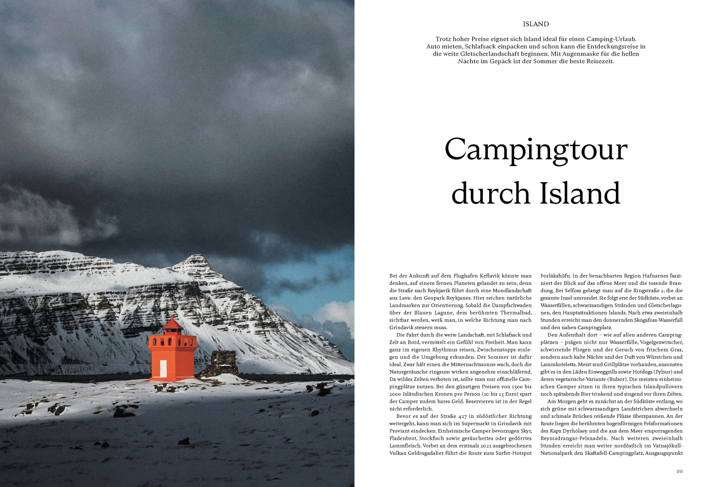 Eine Museums-Tour in Tasmanien, Vogelbeobachtung in London, machen Sie eine Entdeckungsreise zur florierenden Fashion-Community in Dakar, eine Fahrradtour durch Idaho oder wandern Sie auf dem Weinpfad von Lanzarote - kommen Sie mit an Orte, die Sie bei Ihrer Reiseplanung bestimmt noch nie im Hinterkopf hatten. Kinfolk Travel widmet sich dem städtischen Raum und stellt außergewöhnliche Sehenswürdigkeiten in Metropolen wie Mumbai, Paris oder Santiago vor, es konzentriert sich aber auch auf Reisen in der wilden Natur, beispielsweise in den Schottischen Highlands, in Georgien oder Israel. Abschließend blickt der Reiseführer noch auf das Unterwegssein an sich und stellt Reisen vor, bei denen der Weg das eigentliche Ziel ist - vom Roadtrip durch die Arabischen Emirate über einen Segeltörn um die griechischen Inseln bis zur Zugreise von Oslo nach Bergen.