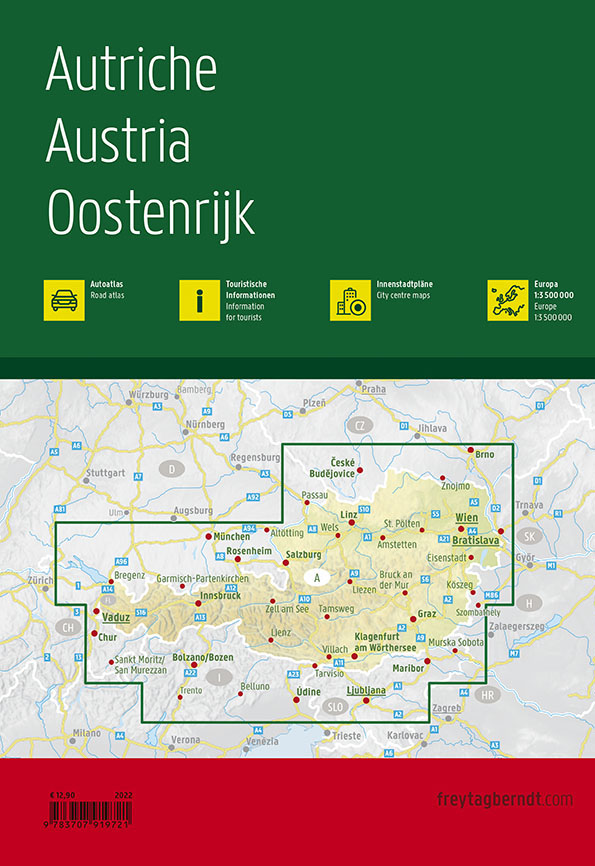 Neben der übersichtlichen Gestaltung bietet der "Straßen-Atlas Österreich 1:200.000" zahlreiche Zusatzinformationen wie z.B. Sehenswürdigkeiten, Campingplätze und zahlreiche Stadtpläne. - Erweiterter Kartenteil- Ortsregister mit Postleitzahlen- Planungskarte Europa 1:3,5 Mio.- Staateninformationen Europa- Stadtpläne mit Straßenverzeichnis von Bregenz, Eisenstadt, Graz, Innsbruck, Klagenfurt am Wörthersee, Linz, Salzburg, St. Pölten und Wien; freytag & berndt Autoatlanten sind für viele Länder und Regionen weltweit erhältlich.
