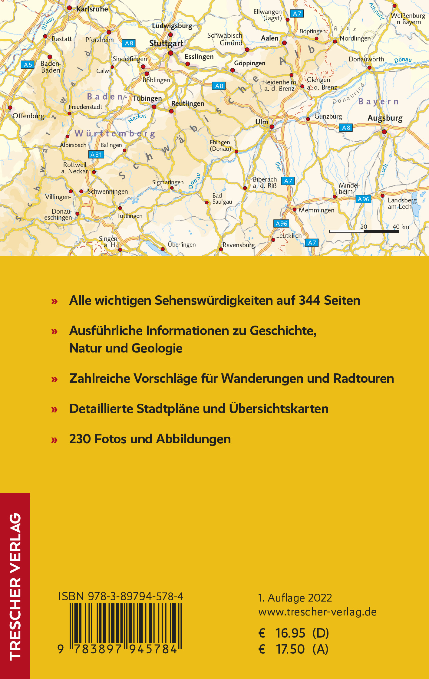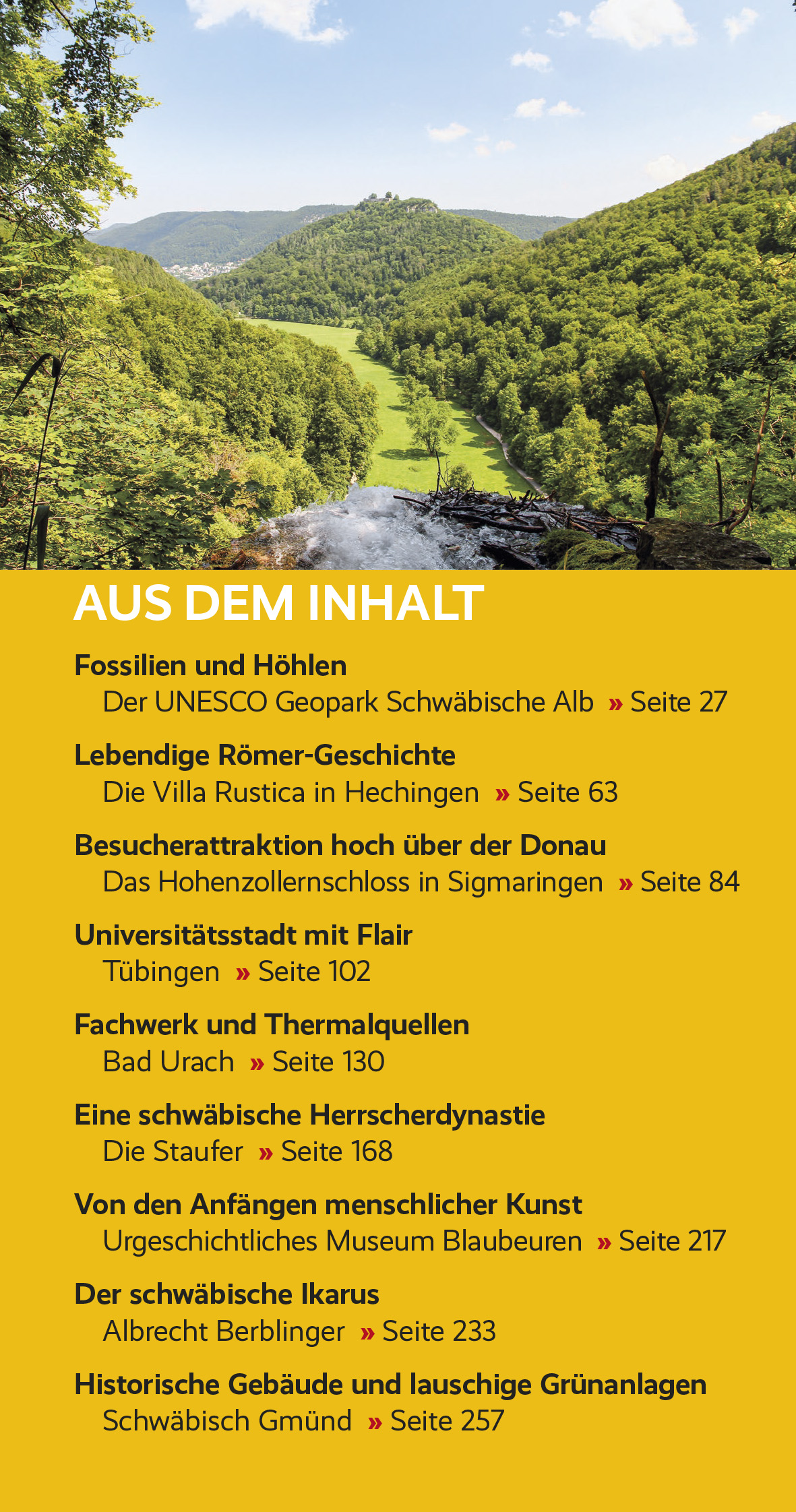 Vorwort 11Herausragende Sehenswürdigkeiten 12Das Wichtigste in Kürze 14Entfernungstabelle 16Unterwegs mit Kindern 17LAND UND LEUTE 21Geographie 22Der Naturraum Schwäbische Alb 24Geologie 26Die Tier- und Pflanzenwelt der Alb 30Bevölkerung und Geschichte 31Die schwäbische Mentalität 31Der schwäbische Dialekt 33Geschichte im Überblick 34Architekturgeschichte 36Bräuche und Feste 38Essen und Trinken 39Aktivitäten 45Fernwanderwege 45Fernradwege 47Die schönsten Zugstrecken 48WESTLICHE ALB 51Zwischen Albtrauf und Blauer Donau 52Haigerloch 52Wanderung Haigerloch: der Römerturm-Rundweg 59Hechingen 60Burg Hohenzollern 65Wanderung am Aussichtspunkt Zeller Horn 68Balingen 71Albstadt-Lautlingen 75Wanderung Traufgang Hossinger Leiter 77Albstadt-Ebingen 80Albstadt-Tailfingen 82Onstmettingen 82Sigmaringen 84Campus Galli 88Burg Wildenstein 89Erzabtei Beuron 90Wanderung Beuron-Hausen im Tal 91Knopfmacherfelsen/Schloss Bronnen 92Kolbinger Höhle 92Freilichtmuseum Neuhausen ob Eck 93Tuttlingen 94MITTLERE ALB 99Tübingen und Umgebung 102Geschichte der Stadt 102Historische Altstadt 104Schloss Hohentübingen 110Kunsthalle Tübingen 111Botanischer Garten 112Kloster und Schloss Bebenhausen 115Wanderung von Tübingen zur Wurmlinger Kapelle 115Reutlingen und Umgebung 118Geschichte 118Altstadt 119Metzingen 127Bad Urach 130Wanderung zum Uracher Wasserfall 135Schönbergturm Pfullingen 136Nebelhöhle 136Schloss Lichtenstein 139Bärenhöhle 140Nürtingen und Umgebung 142Geschichte 142Sehenswertes in Nürtingen 143Neuffen 149Wanderung auf Hölderlins Spuren 149Beuren 151Wanderung von Neuffen nach Beuren 152Kirchheim unter Teck 153Umgebung von Kirchheim unter Teck 159Radtour um Kirchheim 159Göppingen und Umgebung 161Sehenswertes in Göppingen 162Schloss Donzdorf 166Burgruine Hohenstaufen 166Höhlen um Gutenberg und Schopfloch 170Schloss Weißenstein 170Rund um Geislingen an der Steige 171Geschichte 171Sehenswertes in Geislingen 173Bad Überkingen 177Schloss und Wallfahrtskirche Hohenstadt 177Wanderung auf dem Erlebnis-pfad Geislinger Steige 177Wanderung entlang des Löwenpfads (Steigen-Tour) 177Bad Ditzenbach 178Rund um Wiesensteig und Neidlingen 179Wanderung auf der Filsursprungrunde 181Wanderung auf dem Wiesensteiger Geopfad 181Zwischen Trochtelfingen und Zwiefalten 183Trochtelfingen 183Haupt- und Landgestüt Marbach 184Gedenkstätte Schloss 185Grafeneck 185Münsingen 186Umgebung von Münsingen 189Spazier-Wanderung: "hochgehütet" am Beutenlay 193Großes Lautertal 196Wimsener Wasserhöhle 197Zwiefalten 197Entlang der Donau 201Kloster Obermarchtal 201Munderkingen 202Riedlingen an der Donau 204Freilichtmuseum Heuneburg - Stadt Pyrene 207Ehingen 208Wanderung auf dem Bierwanderweg 212Zwischen Laichingen und Blaubeuren 213Laichingen 213Blaubeuren 216Wanderung auf dem Karstkundlichen Wanderweg 216Kloster Blaubeuren 219Wanderung zur Kleinen Grotte, zum Rusenschloss und zum Knoblauchfelsen 221Schelklingen 222Wanderung rund ums Achtal 222Ulm 224Geschichte 224Südliches Zentrum 229Nördliches Zentrum 234Rund um den Eselsberg 242Friedrichsau 243Ausflug ins bayerische Neu-Ulm 243Wanderung auf dem Festungsweg 250Kloster Wiblingen 251Steinzeitdorf Ehrenstein 251OSTALB 253Schwäbisch Gmünd und Umgebung 256Sehenswertes in Schwäbisch Gmünd 257Wanderung vom Zentrum über die Burg Hohenrechberg bis zur Barockkirche St. Maria 267Wanderung durch das Fels