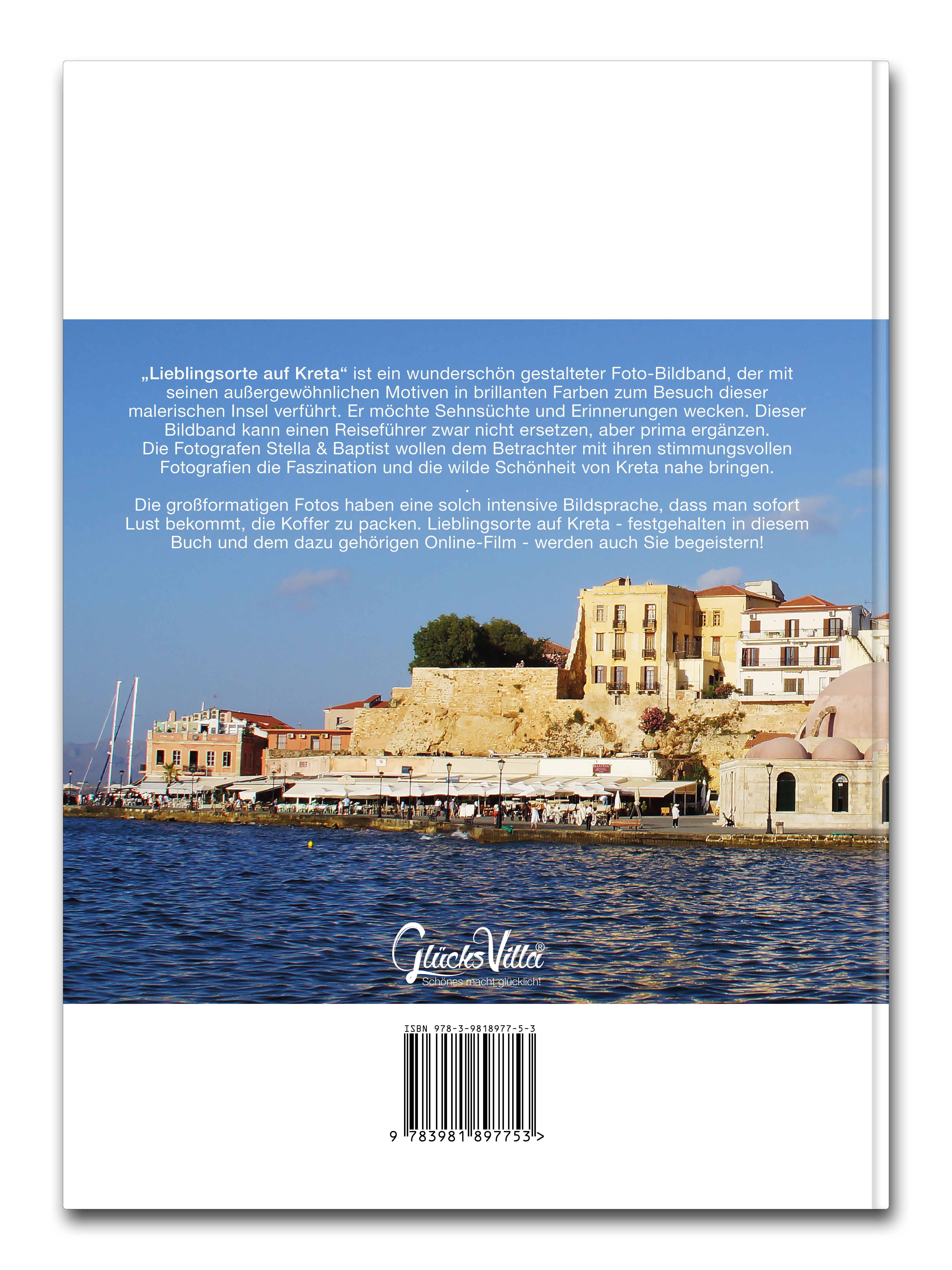 In diesem Buch finden Sie ganz bezaubernde „Standbilder“. Unser Film setzt diese in Bewegung. Unter www.glücksvilla.de/Kreta-Film können Sie die Umgebung unserer Motive erkunden, in wunderschöne Orte eintauchen, das einzigartige Flair erspüren und die Küstenlandschaften rund um die Insel Kreta genießen. Film ab und viel Vergnügen!