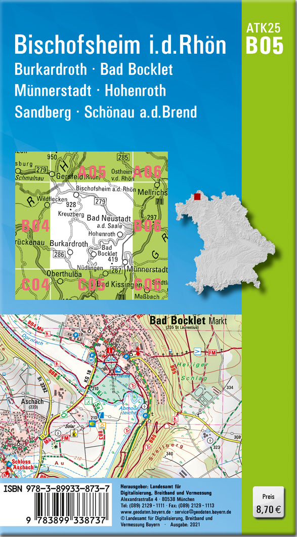 Wer es genau wissen will, greift zur ATK25. Diese Kartenserie im Maßstab 1:25000 bildet mit ihrer detaillierten Darstellung das komplette Verkehrsnetz mit allen Straßen und Wegen ab.237 Einzelblätter stellen Bayern flächendeckend dar. Ein Kartenblatt umfasst ca. 21 km x 22 km.Was bietet die ATK25?- individuelle Freizeitgestaltung mit allen ausgeschilderten Wander- und Radwanderwegen- sichere Orientierung auch abseits der markierten Routen- umfangreiches Spektrum an Freizeiteinrichtungen und Sehenswürdigkeiten- anschauliche Wiedergabe der GeländeformenKartenblatt ATK25-B05 Bischofsheim i.d.Rhön:REGION: Unterfranken, Rhön, Schwarze BergeORTE: Bischofsheim i.d.Rhön, Burkardroth, Bad Bocklet, Münnerstadt, Hohenroth, Sandberg, Schönau a.d.Brend