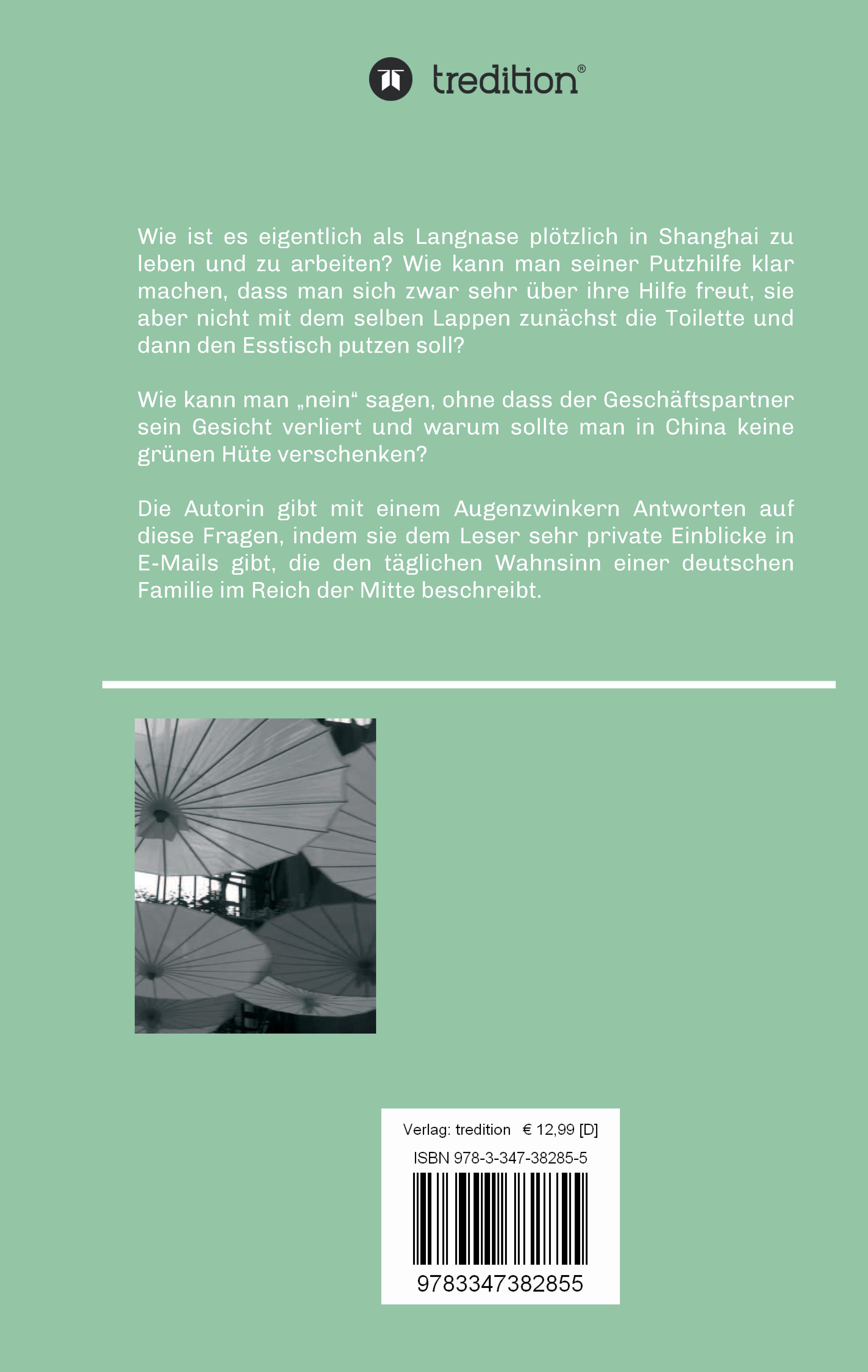 Urda Schleier, geboren 1975, zog mit ihrer vierköpfigen Familie für drei Jahre nach Shanghai und nahm paralell dazu noch ein Fernstudium auf. Wie ist es eigentlich als Langnase plötzlich in Shanghai zu leben und zu arbeiten? Wie kann man seiner Putzhilfe klar machen, dass man sich zwar sehr über ihre Hilfe freut, sie aber nicht mit dem selben Lappen zunächst die Toilette und dann den Esstisch putzen soll? Wie kann man "nein" sagen, ohne dass der Geschäftspartner sein Gesicht verliert und warum sollte man in China keine grünen Hüte verschenken? Die Autorin gibt mit einem Augenzwinkern Antwort auf diese Fragen, indem sie dem Leser sehr private Einblicke in E-Mails gibt, die den täglichen Wahnsinn einer deutschen Familie im Reich der Mitte beschreibt.