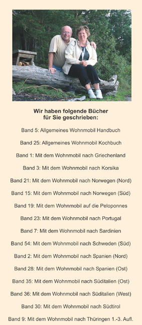 EINLADUNG Hellas – ein Name wie ein Traum. Die südliche Sonne malt Lichtkringel auf azurblaue Wellen. Knorrige Ölbäume spenden milden Schatten am unberührten Sandstrand. Wuchtige Marmorsäulen zeugen unvergänglich aus klassischer Zeit. Grandiose Bergkulissen locken zu unvergesslicher Tour. Ein Bäuerlein reitet vergnügt pfeifend auf seinem Eselchen nach Hause. Da setzt donnernd ein Urlauber-Jet zur Landung an. Menschenmassen quellen heraus, der Traum verfliegt. Aber steigen Sie ruhig in Ihr Wohnmobil ein – es ist ein Zauberfahrzeug! Mit ihm können Sie noch das ursprüngliche Griechenland "erfahren" und an den schönsten Plätzen verweilen. Wie das geht? Folgen Sie uns, wir adoptieren Sie für eine Reise (oder für weitere, falls Sie wie wir von Griechenland nicht mehr loskommen können, denn es gibt auch noch "Mit dem Wohnmobil nach Griechenland" und "Mit dem Wohnmobil nach Kreta" von uns). Und da Sie jetzt zur Familie gehören: Wir sind für jede neue Information – aber auch für sachliche Kritik stets dankbar. Ihre Waltraud Roth-Schulz (Verlegerin)
