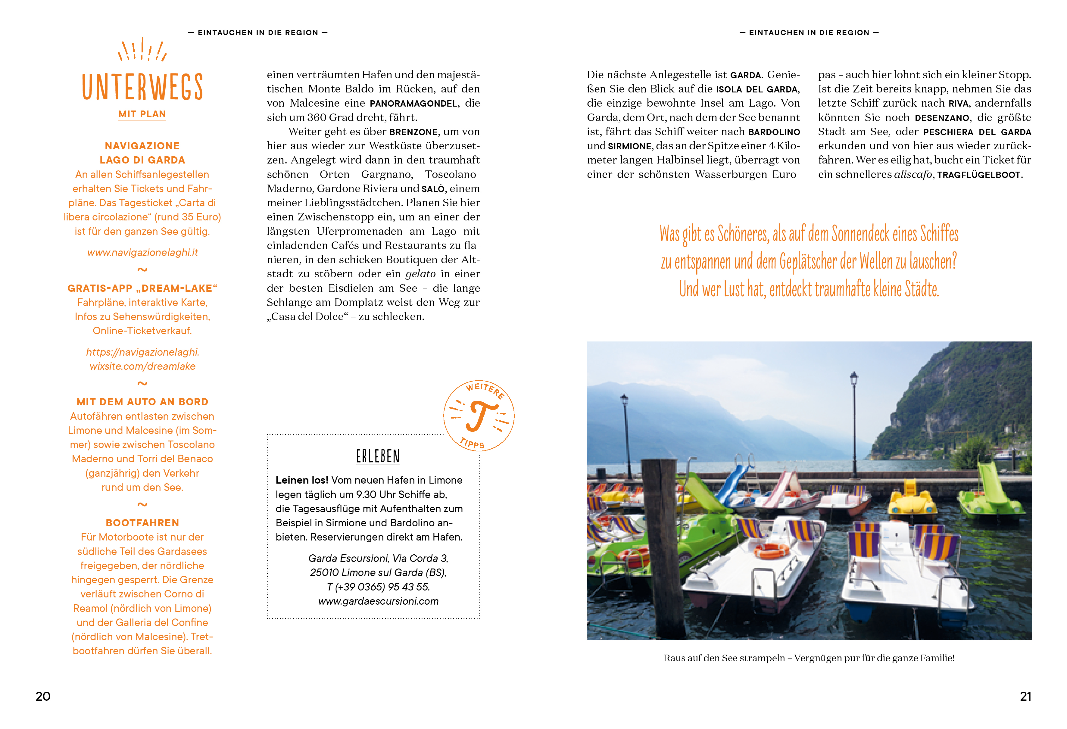 Lago di Garda - da ist das Dolce Vita nur eine Autofahrt entfernt! Insiderin Beate Giacovelli inspiriert zum Eintauchen in die Region: mit unvergesslichen Ausflügen rund um den See und unkomplizierten Erlebnisideen im Umland. Am Plan steht, was Spaß macht: Lieblingsorte und Aktiv-Zeit, Genussmomente, Entdecken und Staunen - mit dem Partner, mit Freunden oder mit der ganzen Familie.Urlaubsfeeling vom ersten Schmökern bis zum Nachhausekommen ist hier garantiert. Und mit vielen Spontan-Tipps geht auch bei Schlechtwetter und knurrendem Magen nichts mehr schief.